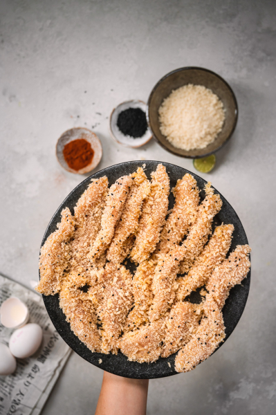 Proužky masa obalte nejdříve v mouce, poté ve vejci, a nakonec v panko strouhance. Strouhanku do stripsů v žádném případě nezamačkávejte, pouze je v ní lehce obalte a položte na vál či prkénko. Právě díky našlehaným vejcím a lehkému, neudusanému trojobalu budou stripsy krásně kypré a křupavé. Obalené je pokládejte vedle sebe, nikdy ne na sebe, jinak zvlhnou. Zároveň je důležité smažit je okamžitě po obalení a nepřipravovat je dopředu.