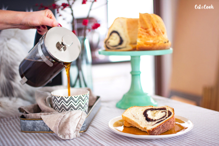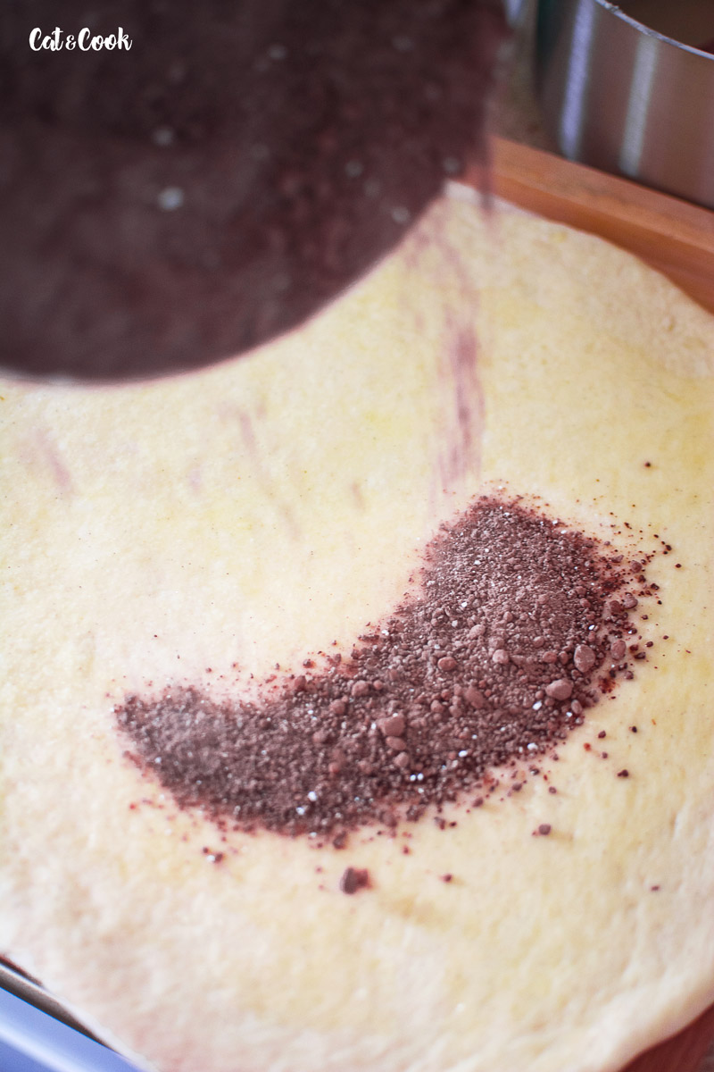 Plát potřete rozpuštěným máslem a bohatě zasypte kakaem smíchaným s moučkovým cukrem. Pokud máte doma 75% čokoládu, přidejte ji klidně také 🙂 Nakonec to celé opět zastříkněte rozpuštěným máslíčkem. Budoucí bábovku opatrně a pevně srolujte do pomyslné rolády.