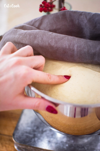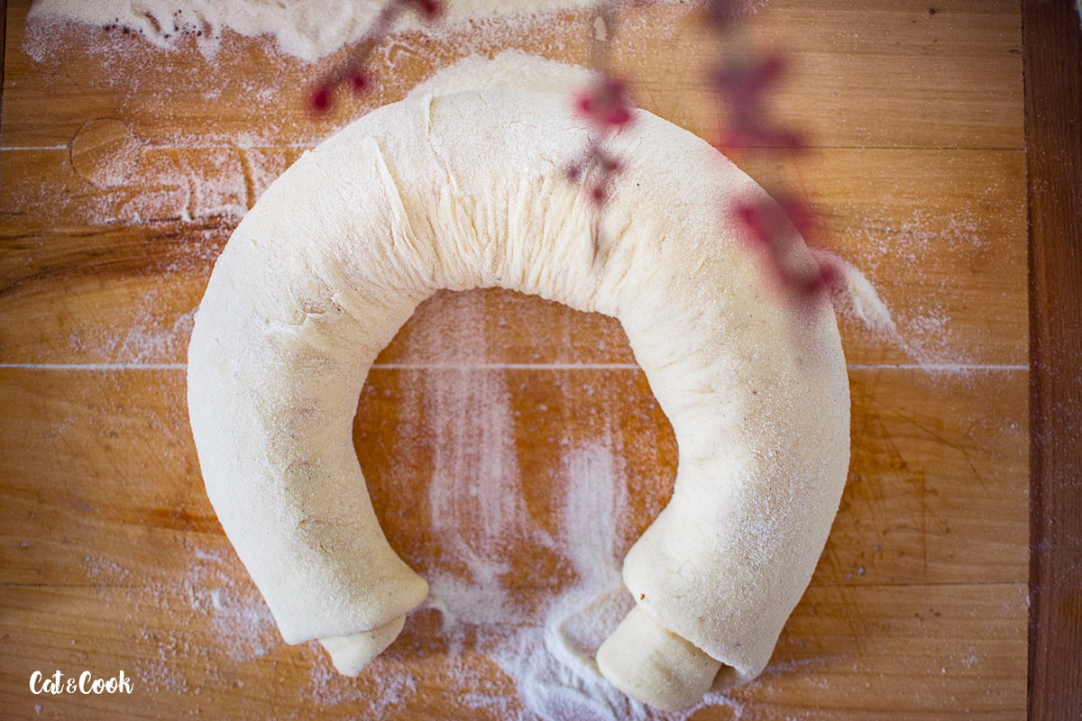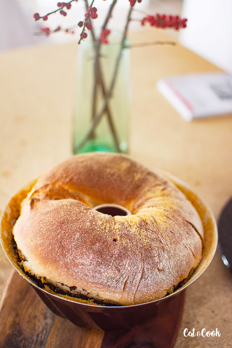 Až bude těsto krásně vykynuté, na vále ho rozválejte na plát silný asi 1 cm. Plát by měl být v šíři takové, abyste ho stočili do vaší formy na bábovku a pohodlně oba konce spojili.