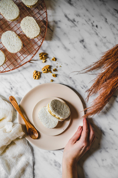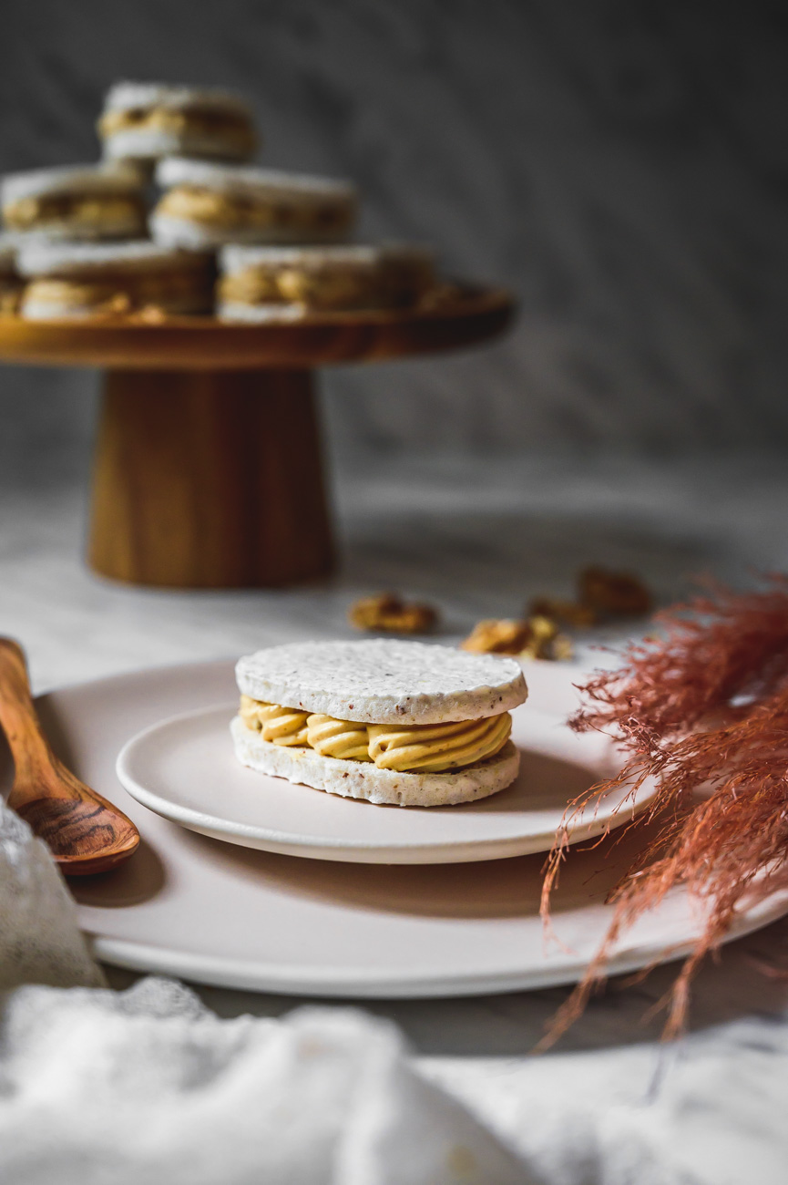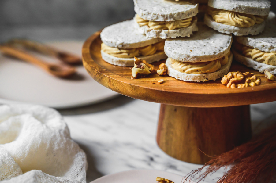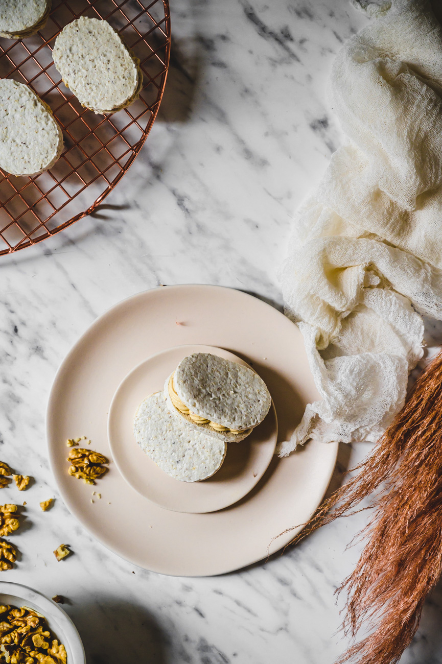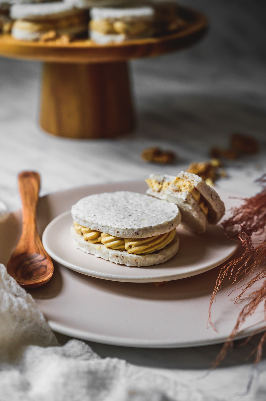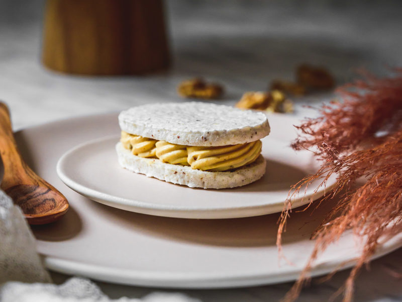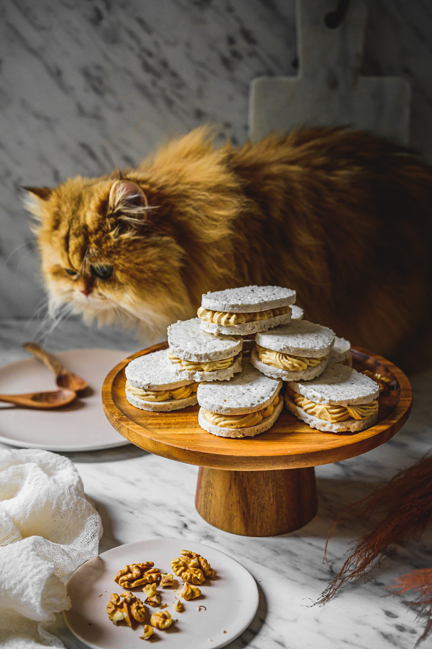 Laskonka je typicky český druh zákusku, který snad každý známe od mala. 🙂 Obešla jsem Myšáka, Skálu a další své oblíbené cukrárny a laskonky ochutnala. Je skvělé, že se alespoň někde dělají tradičně a poctivě – tedy především z ořechů, a ne z kokosu, který se začal časem používat jako levnější náhrada. Do laskonky patří máslový krém, do kterého se přimíchává griliáš, což je karamel s ořechy, který se rozmixuje na hrubší prach. Protože vím, že máslový krém je pro spoustu lidí trochu těžší, z většiny griliáše jsem udělala pastu praliné a přimíchala jsem ji do máslového základu. Sladila jsem pomocí slaného karamelu, který laskonce dodal další vlnu chuti. Pokud máte rádi v dezertu i něco kyselého (já to přímo nenávidím:-D), nebojte se použít třeba lemon curd, v sezóně kousky angreštu, rybíz nebo třeba mučenku, či jakékoliv ovocné pyré – záleží na vaší chuti. 🙂