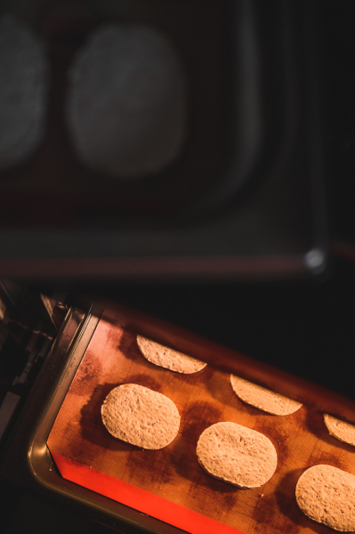 Na plech připravte silikonovou podložku nebo pečicí papír. Na něj položte šablonu na laskonky (koupíte například zde či v cukrářských obchodech a kuchyňkách) a na ni navrstvěte část směsi. Pomocí stěrky nebo špachtle zaplňte mezery a pokračujte, dokud máte místo na plechu. 🙂