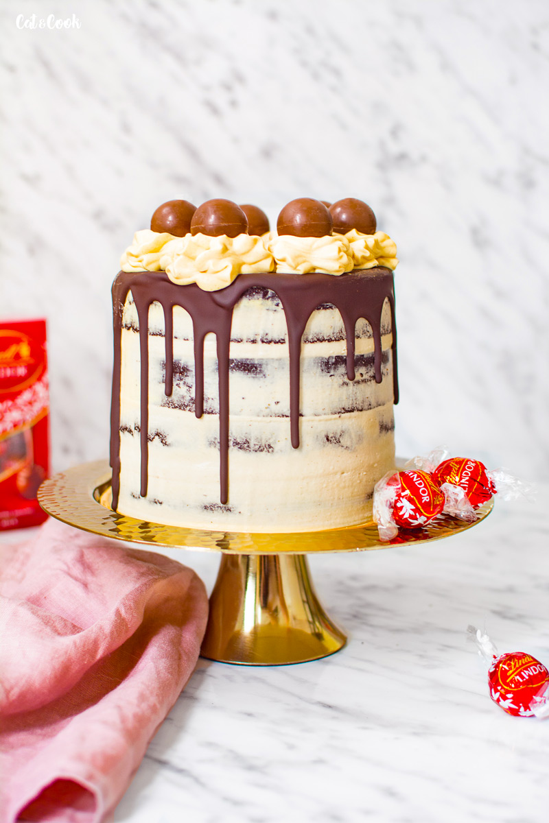 Korpusy podélně rozřízněte (případné vypouklé vršky seřízněte do rovna) a promažte postupně krémem. Já jsem na krém vždy ještě položila tři rozmáčklé Lindor kuličky a posypala je pekanovými ořechy. Nakonec dort zahlaďte kolem dokola a dejte ztuhnout do lednice na 30 – 60 minut.