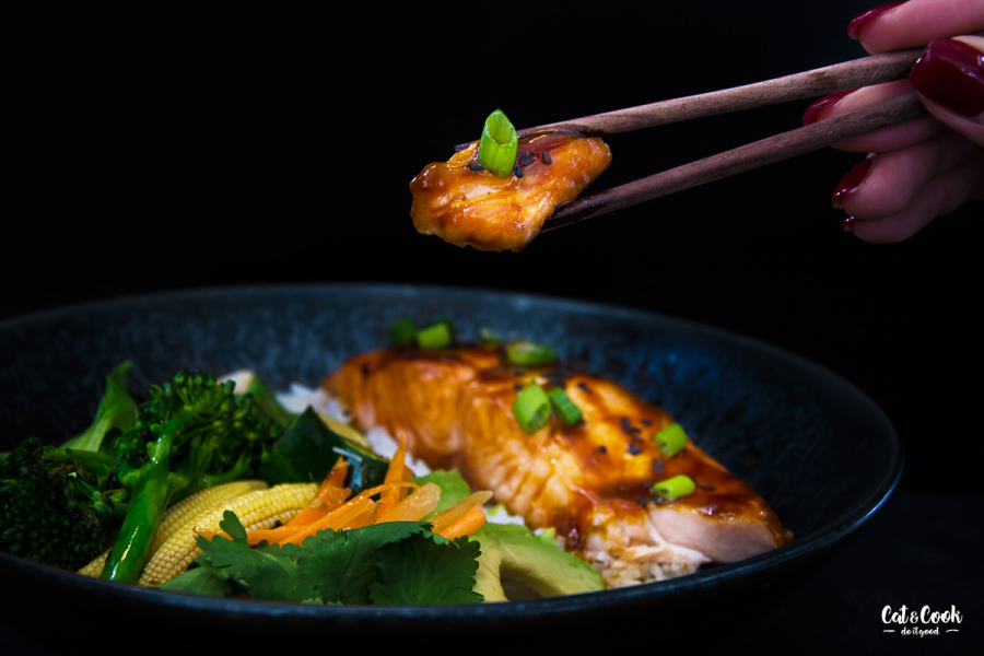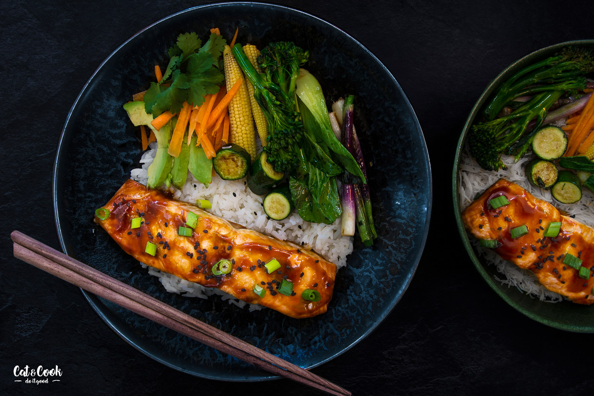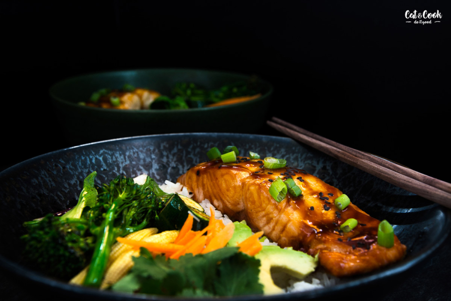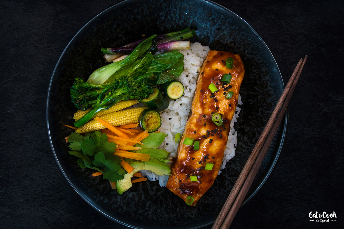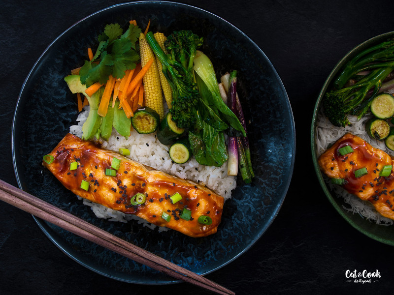 Do servírovací misky nandejte jasmínovou rýži, zeleninu a lososa. Nakonec ho potřete zbytkem teriyaki omáčky a posypte sezamem a jarní cibulkou.