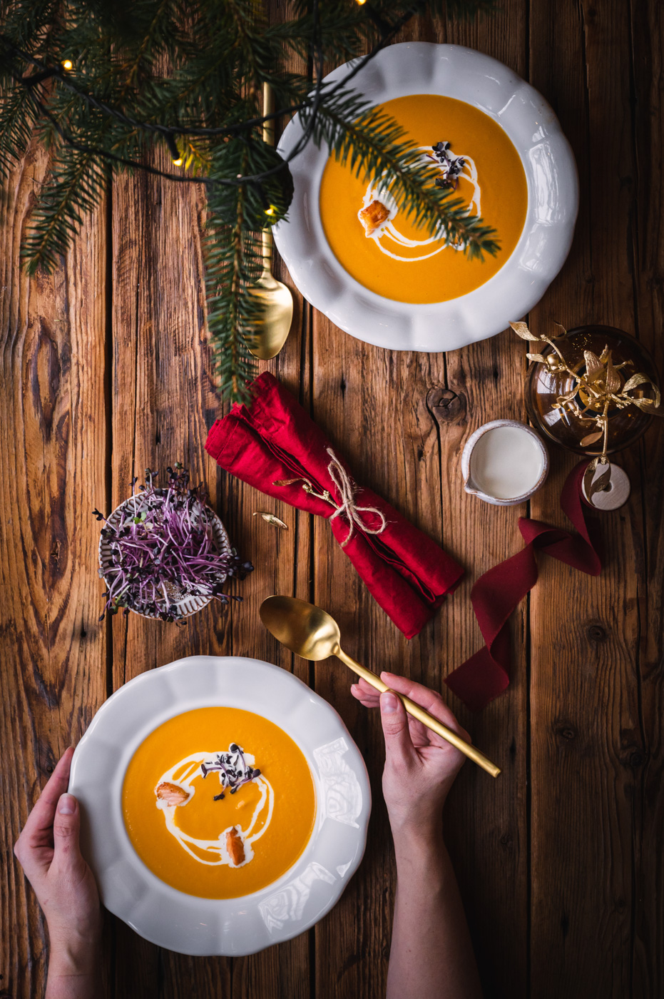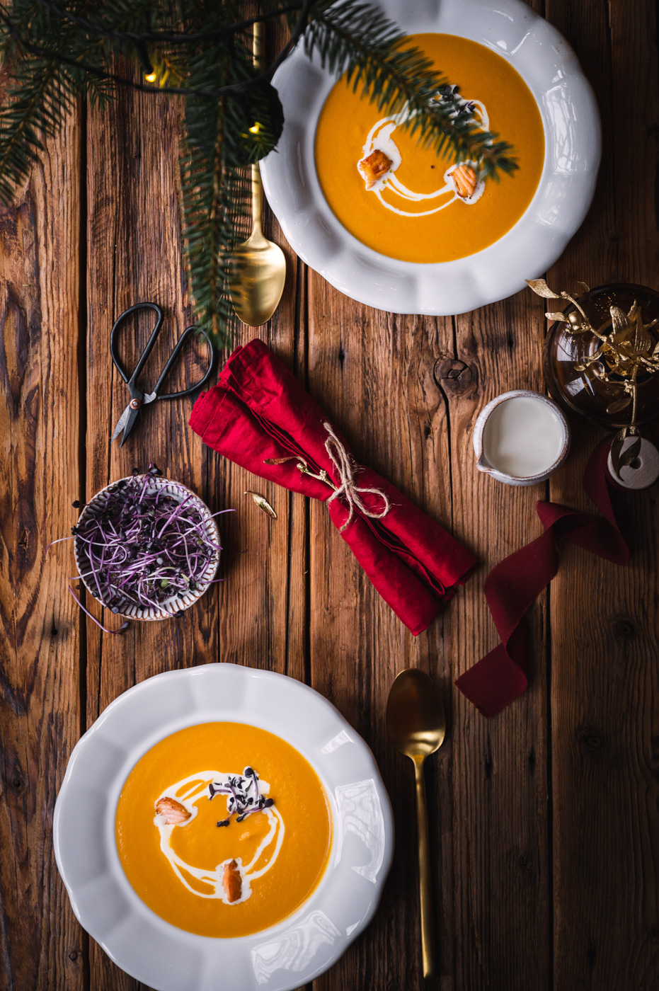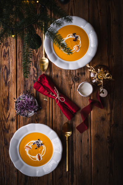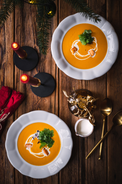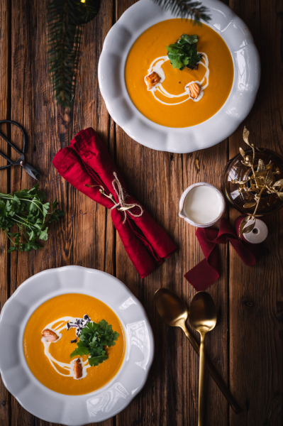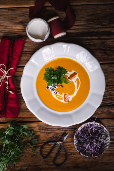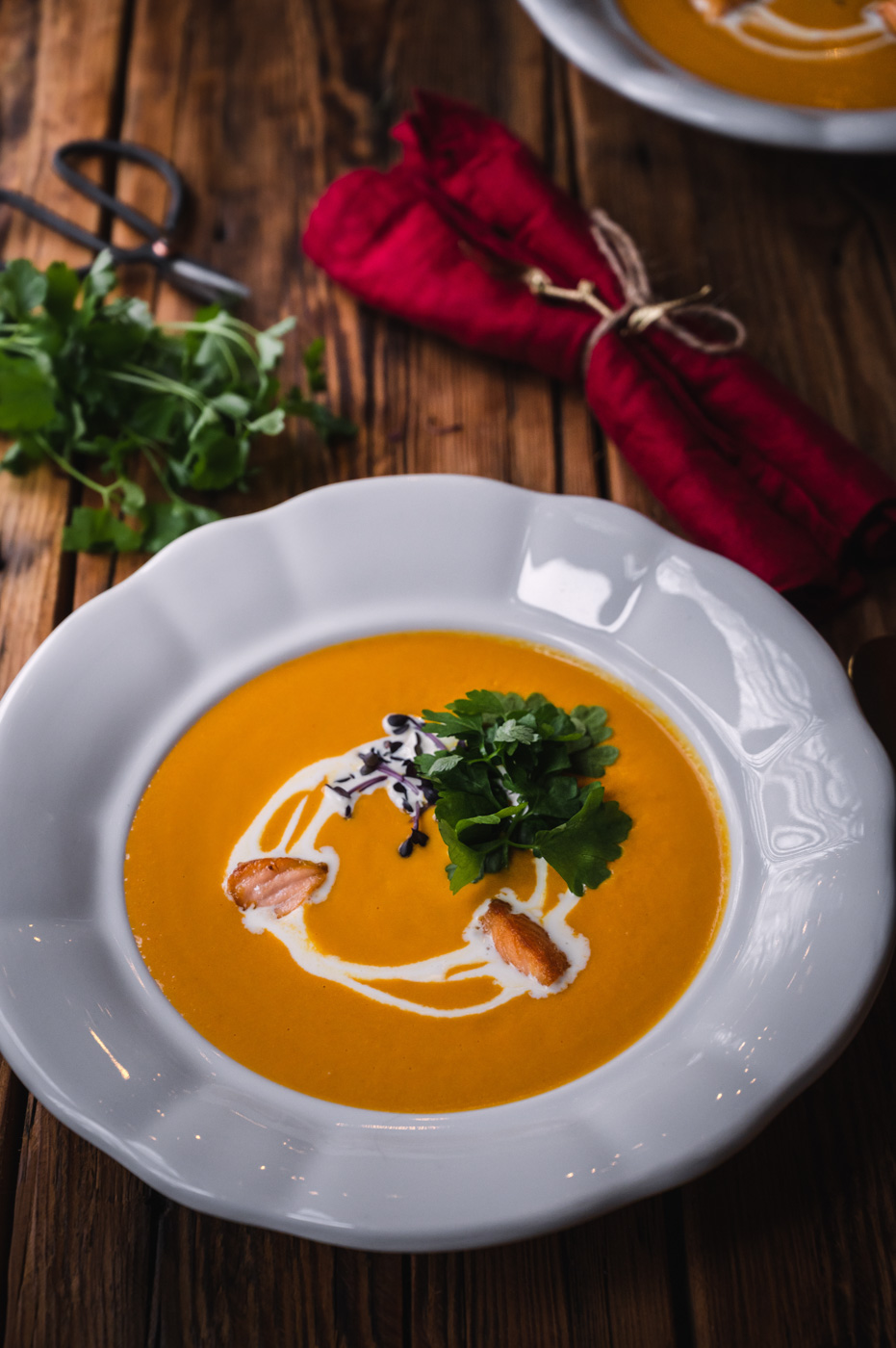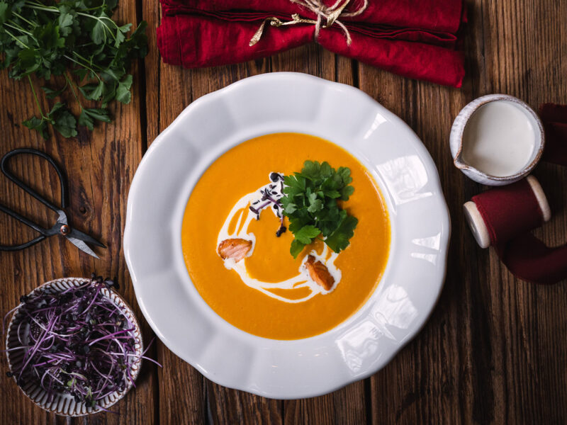 Na talíři polévku ozdobte pořádnou porcí bylinek, smetanou a orestovanými kousky losůska. 🙂  Můžete přidat i tradiční máslové krutony a kapku citrónové šťávy.