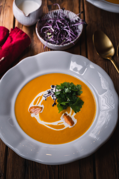 Pokud chcete, nyní můžete přidat trochu smetany a promíchat nebo si ji nechte na ozdobu na servírování. Nemusíte se bát, že by základ ze zeleniny potlačil chuť lososa, naopak, společně s vývarem ji perfektně doplní, protože chuť ryby je velmi výrazná. 🙂