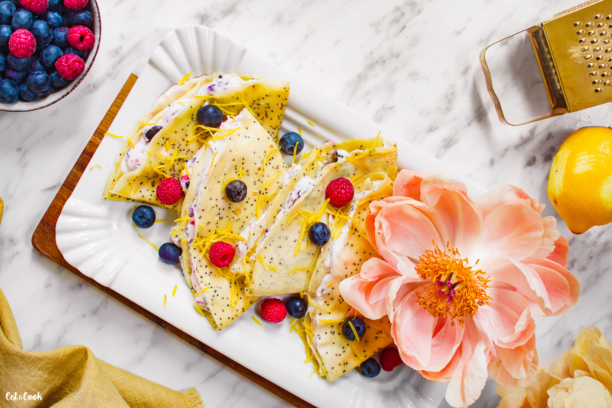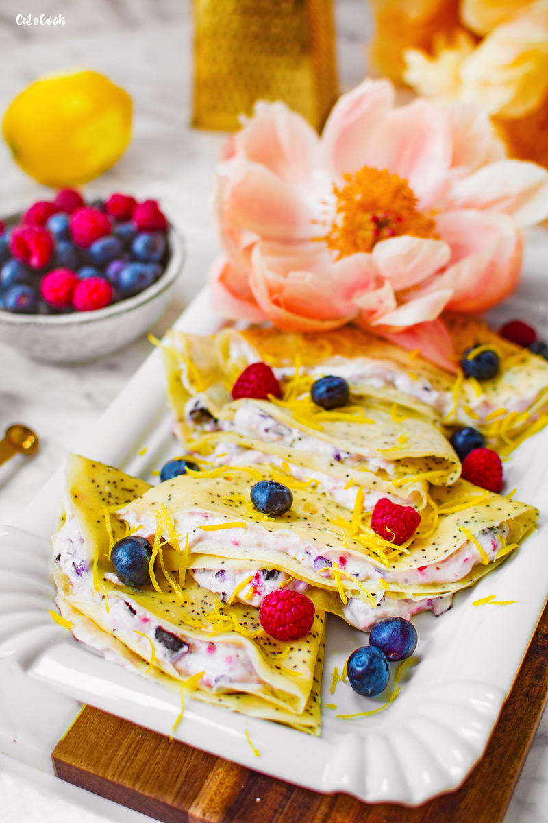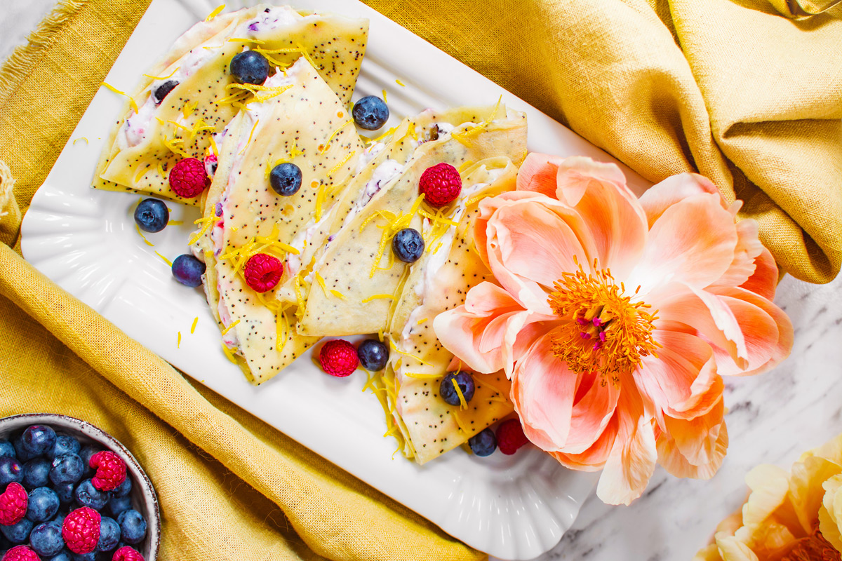 Palačinky promažte krémem a podávejte posypané citrónovou kůrou a ovocem.