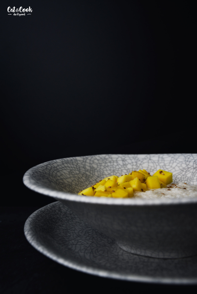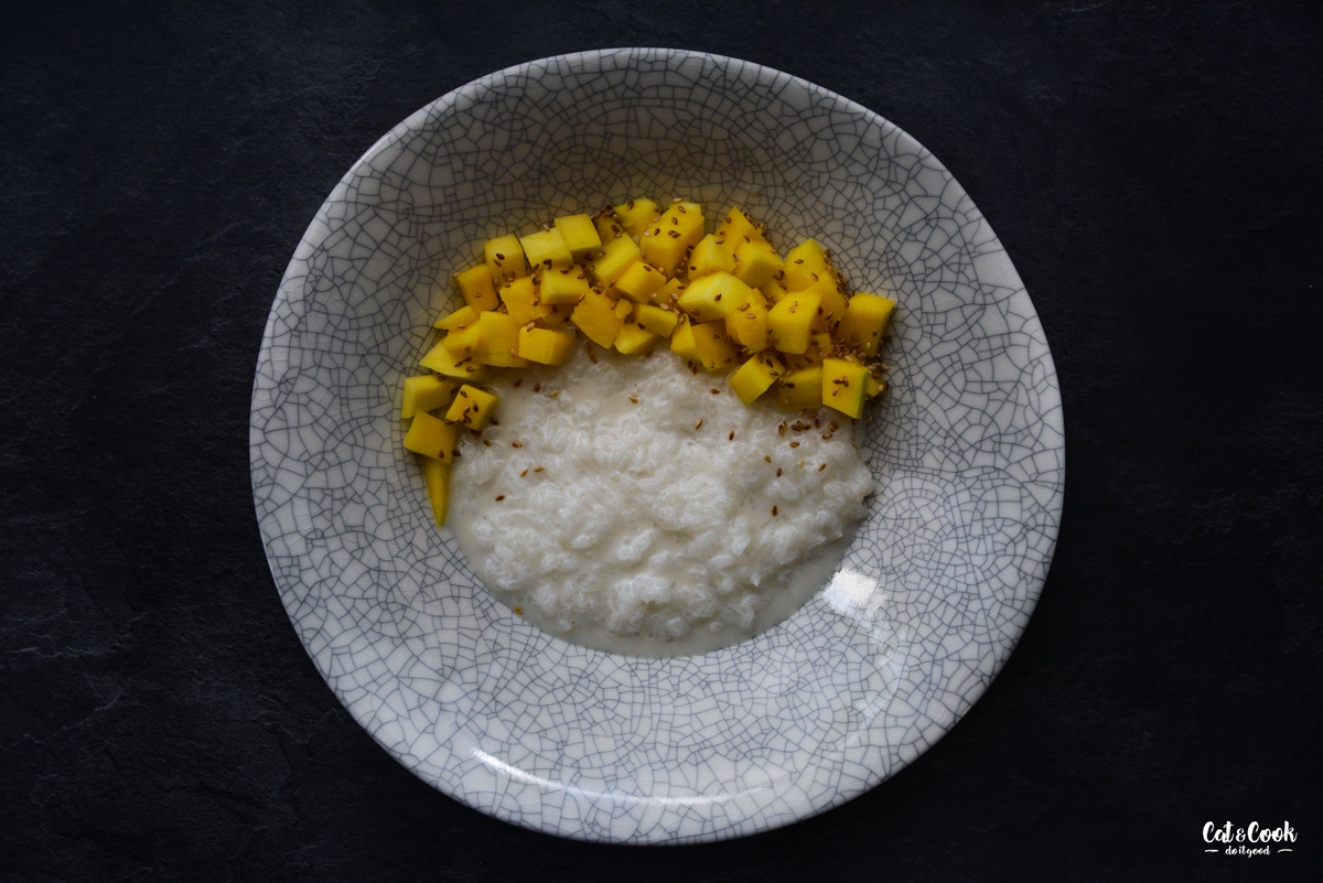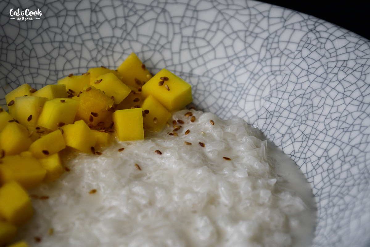 Rýži servíruj na talíři / v misce politou trochou omáčky, obloženou mangem a posypanou sezamem. Tento dezert můžeš podávat teplý nebo pokojové teploty.