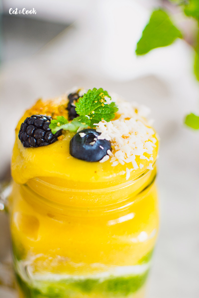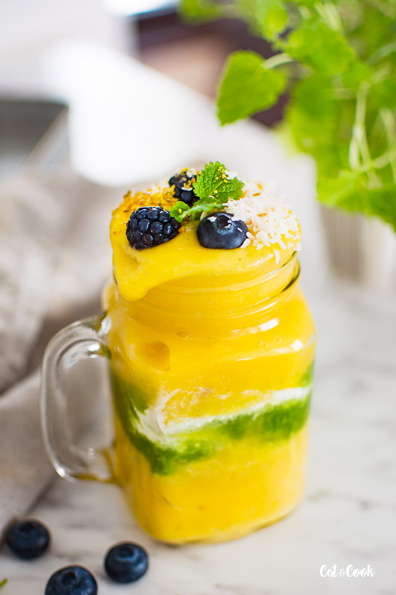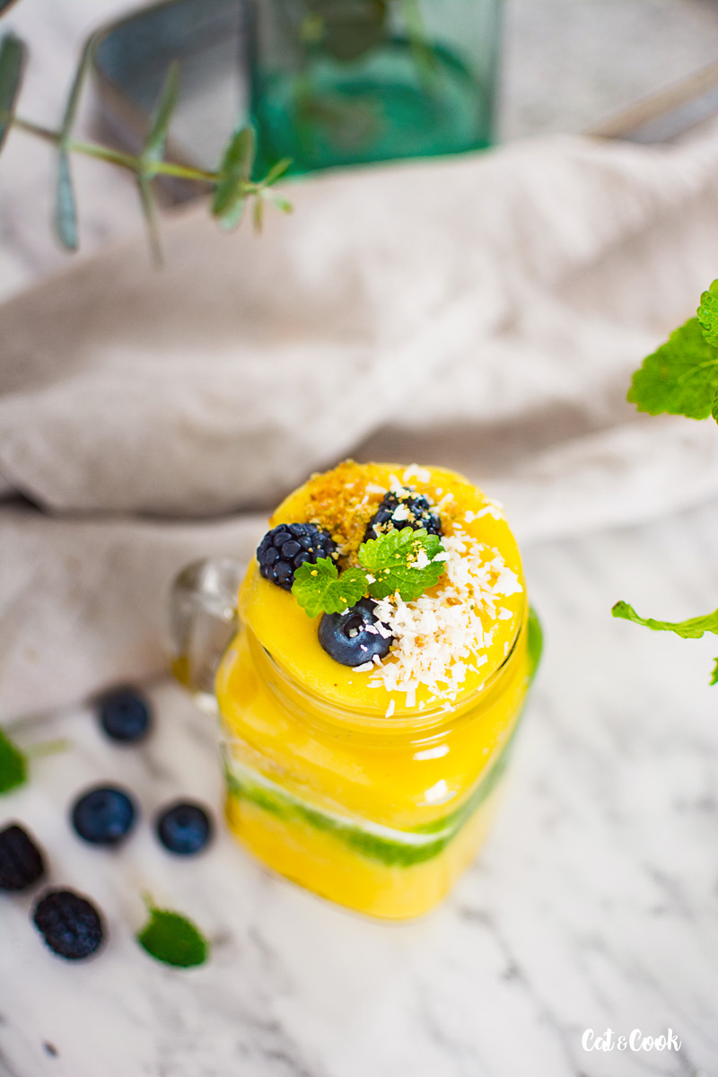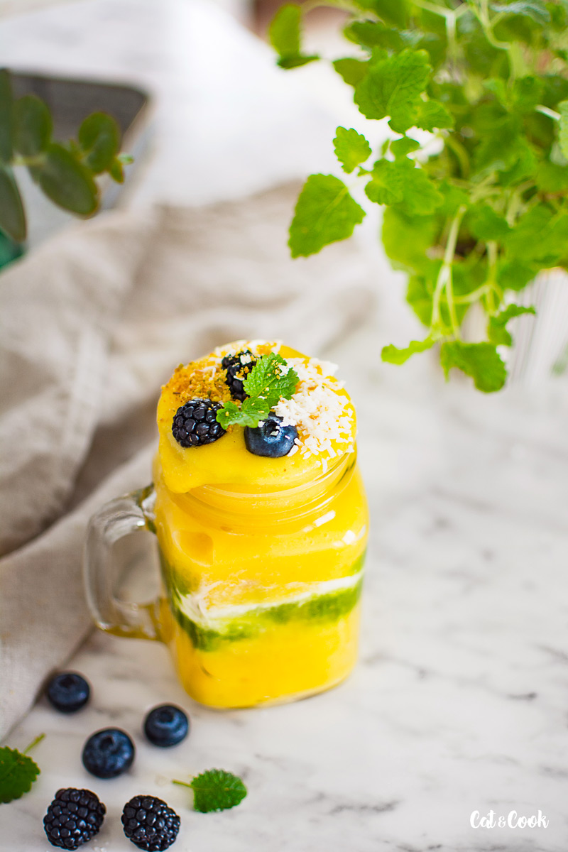 Pokud chcete udělat smoothie bowl, nalijte do mističek a ozdobte třeba ořechy, semínky, kokosem a ovocem či mátou. Pokud budete smoothie pít, nalijte si ho do skleničky 🙂 Já jsem měla v lednici zbytek zeleného smoothie, tak jsem pro efekt do skleniček nalila i trochu toho a přidala jsem i řecký jogurt 🙂