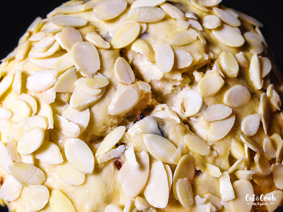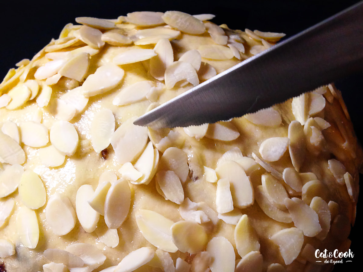 Troubu zapněte na 175 °C (horní a spodní pečení). Vykynutý mazanec potřete prošlehaným vejcem s mlékem / smetanou, na povrchu rozřízněte / prostřihněte do kříže a posypte mandlovými lupínky. Pečte ho v troubě 40–50 minut do zlatohněda. Zda je hotový, poznáte podle vpichového teploměru – pokud ukazuje 90–95 °C, máte pečeno. Pokud teploměr nevlastníte, použijte špejli, která by po vytažení měla být čistá.