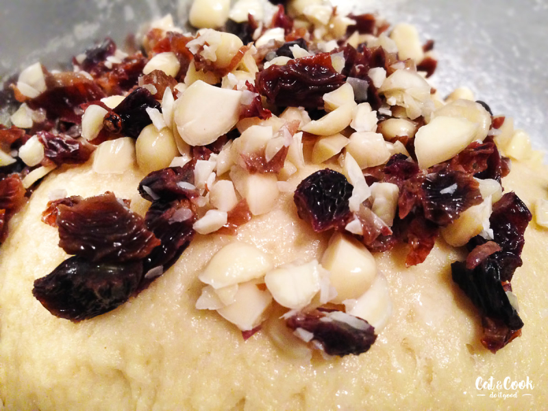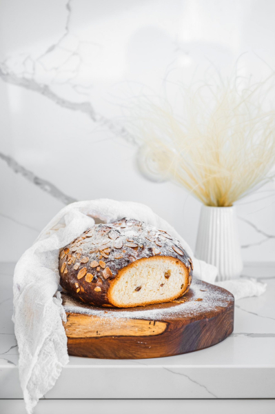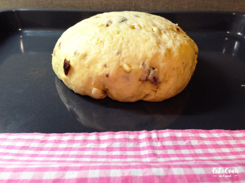 Do mísy robota / zadělávací mísy prosajte polohrubou a hladkou mouku. Přidejte postupně kvásek, vejce, cukr, vanilku, máslo, sůl, nakonec zbylé mléko a vypracujte těsto pomocí hákového nástavce / ručně vařečkou. Pokud bude potřeba, nebojte se přilít trochu mléka navíc, záleží na savosti mouky. Až bude mít těsto tvar, přisypte do něj oříšky s rozinkami a zapracujte. V ruce bude zadělávání celkově trvat asi 15 minut, robotem 10 minut. Je důležité tento čas dodržet, aby mouka pustila lepek a mazanec krásně vykynul a byl vláčný. Těsto hněťte klidně chvíli rukou, aby se pořádně spojilo. Já si ho vždy vyndám na pracovní plochu a jakoby s ním párkrát praštím o desku. 🙂 Lepek tak bude lépe pracovat. Zadělané těsto zpracujte do pravidelné koule a vložte do mísy. Přikryjte ji utěrkou a nechte kynout 45 minut.
