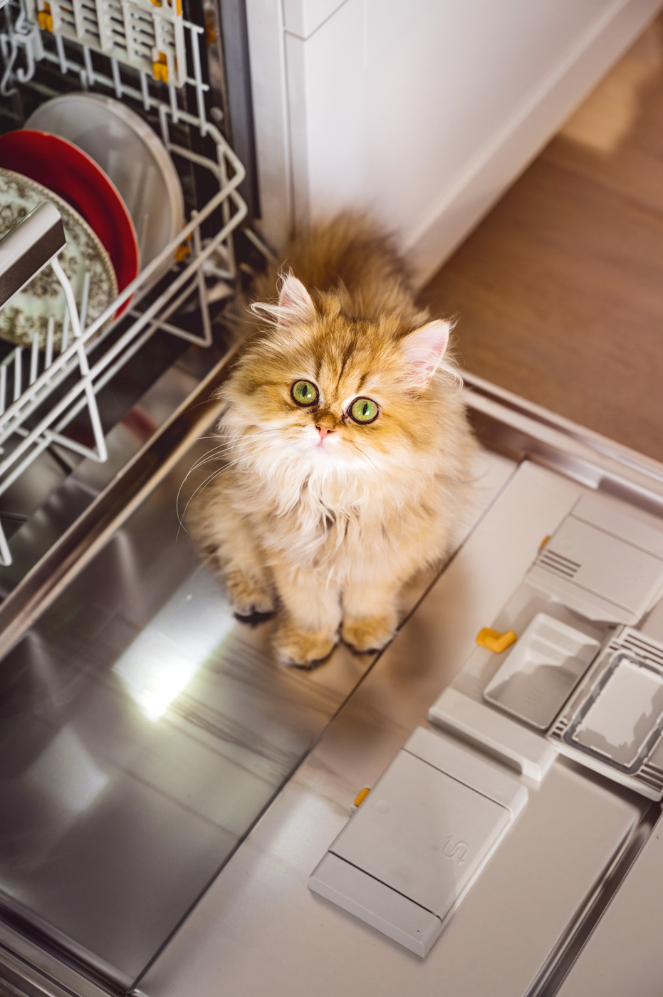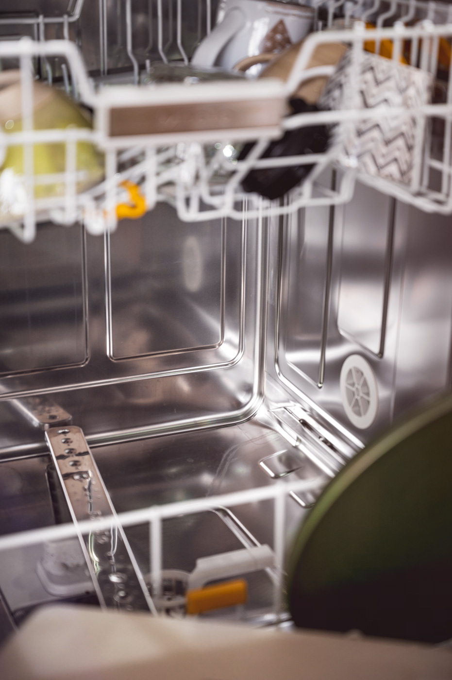 K myčce toho mám také hodně co říct… Upřímně, nikdy jsem si nemyslela, že je mezi myčkami tak velký rozdíl. Jak můžete vidět na fotce, myčka po roce vypadá naprosto jako nová. Takhle vypadá po každém mytí – ať už na nejrychlejší program nebo na intenzivní. A to nepatřím mezi lidi, kteří by do myčky dávali perfektně opláchnuté nádobí…Většinou ho neoplachuji vůbec, případně jen od větších nečistot. Masakr je, že se mi vážně za celý rok nestalo, aby myčka něco neumyla. Pokud navíc zvolím funkci „extra suché“, nádobí je naprosto suché, včetně vršků hrnků a podobných typů nádobí s prohlubní. Opravdu hojně využívám přizpůsobování koše podle toho, zda dolů vkládám vysoké talíře či hrnce. To mi přijde jako naprostá bomba. 🙂