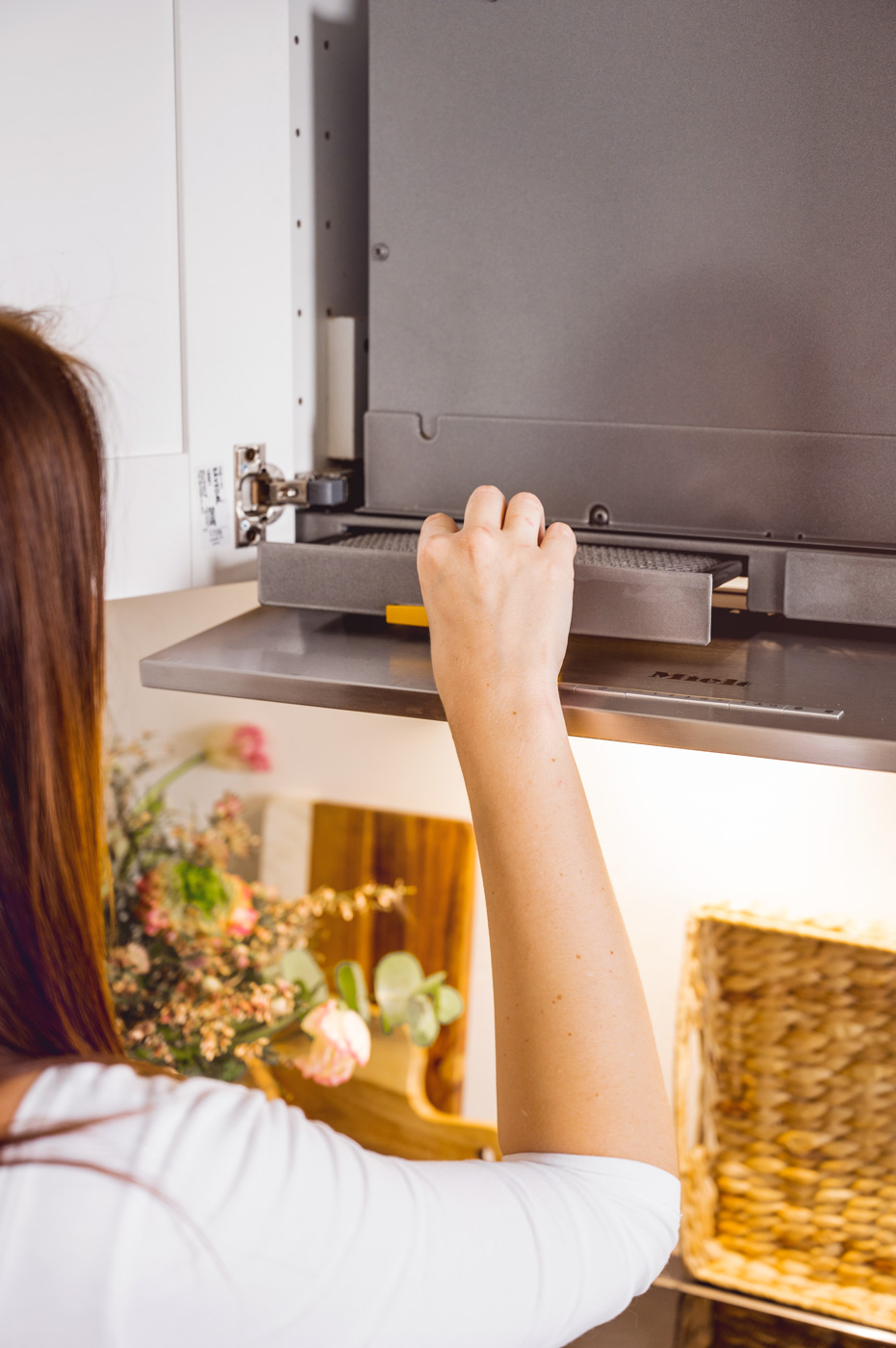 Protože jsem nechtěla viditelnou digestoř, Miele mi vyřešilo problém jejich zabudovanou. Je neskutečně tichá, brutálně výkonná a má dvojitý filtr. Jeden se po čase mění a ten druhý – tukový stačí dát jednou za čas do myčky, což je super.