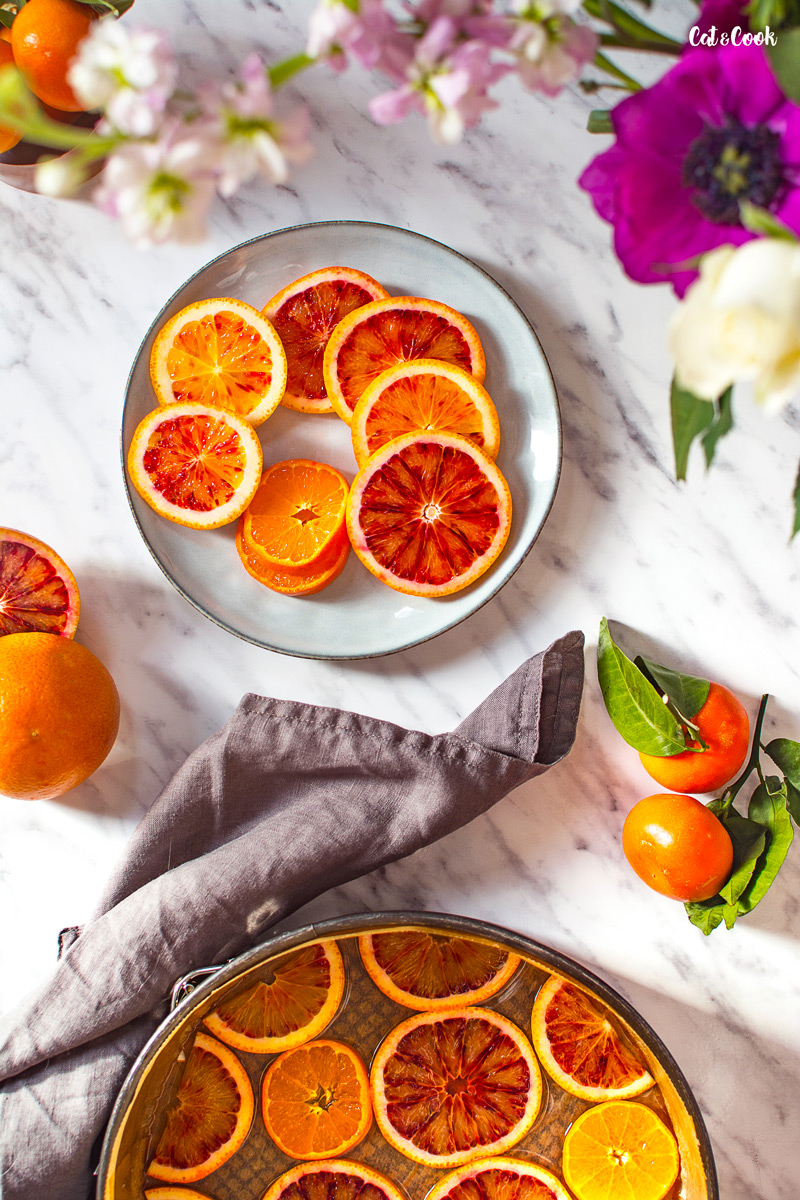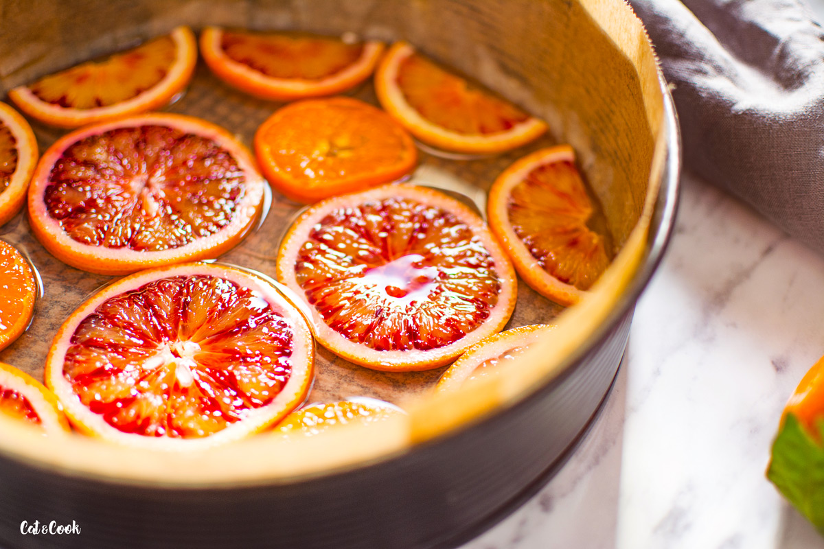 Pomeranče řádně omyjte pod teplou vodou a nakrájejte na silnější plátky (asi 0,5 cm). Cukr s vodou svařte na konzistenci sirupu (ideálně do teploty cca 119 stupňů) a jednu polovinu vlijte do připravené formy. Do cukrového sirupu vložte citrusy, které poté zalijte zbytkem sirupu. Formu pro jistotu zespoda obalte dvojitou dávkou alobalu, protože sirup má tendenci vytékat z formy. Nechte stranou a připravte si těsto.