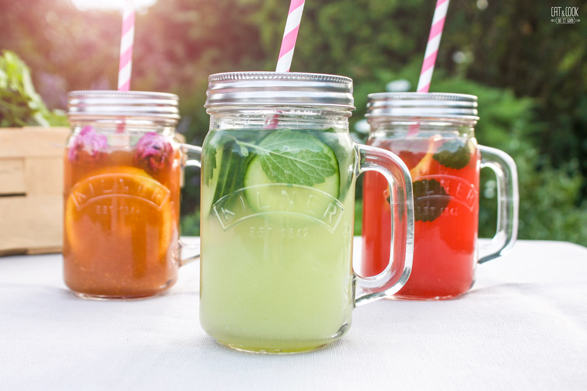 Do KILNER nádoby nalij okurkovou směs, přidej šťávu z citrónů smíchanou s cukrovým rozvarem a zamíchej. Dolij vodou do ¾ sklenice nebo podle chuti. Do nádoby vlož mátu tak, aby se konce máčely v limonádě. Můžeš ji uvázat za hrdlo, aby držela nahoře. Dovnitř sklenice vlož plátky okurky, citrónu a třeba i limetky.