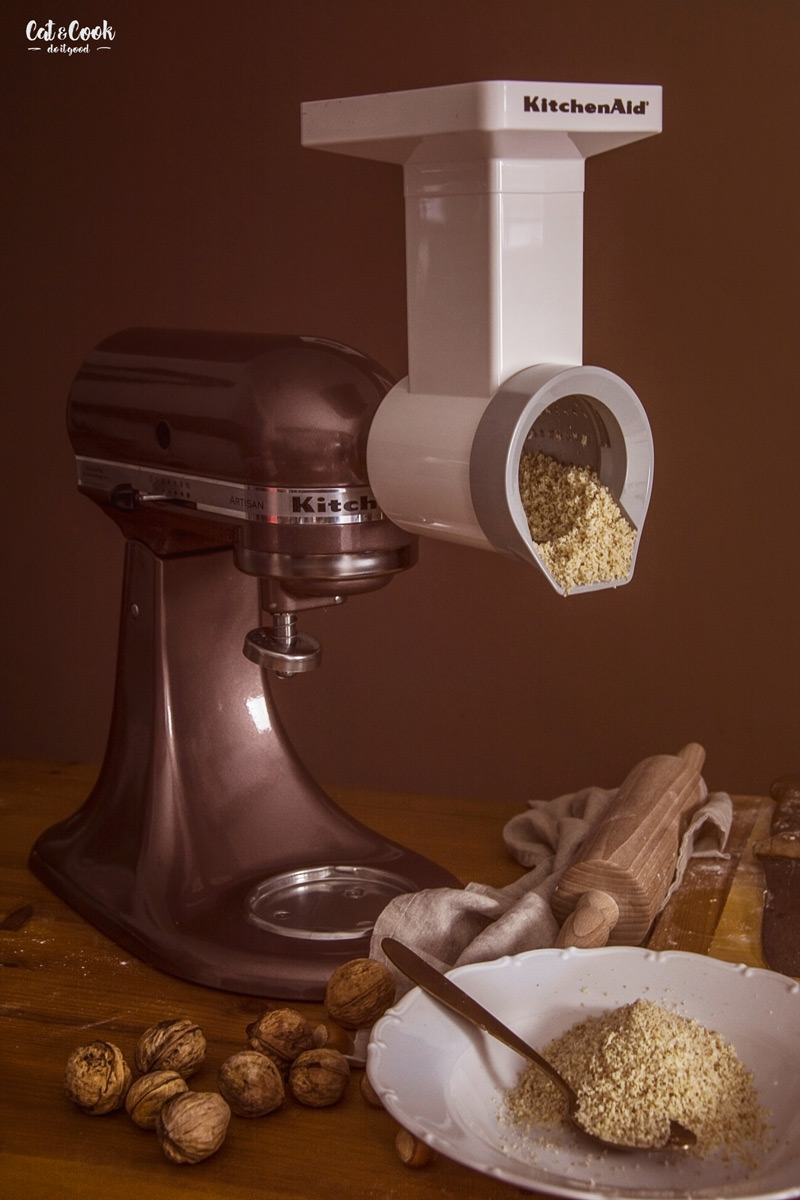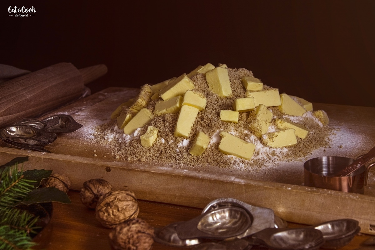Mouku a cukr prosejte na vál. Přisypte najemno namleté ořechy a přidejte na plátky nakrájené máslo. Pokud chcete, aby vaše ořechy byly tmavé, přidejte dvě lžíce kvalitního kakaa. Špičkami prstů zpracujte těsto do pomyslné drobenky a poté ho spojte pomocí hrany dlaně. Vytvořte kouli a zabalte ji do dvou vrstev potravinové fólie. Takto připravené těsto by mělo odpočívat v lednici minimálně 2 hodiny, ale lepší je nechat ho přes noc.