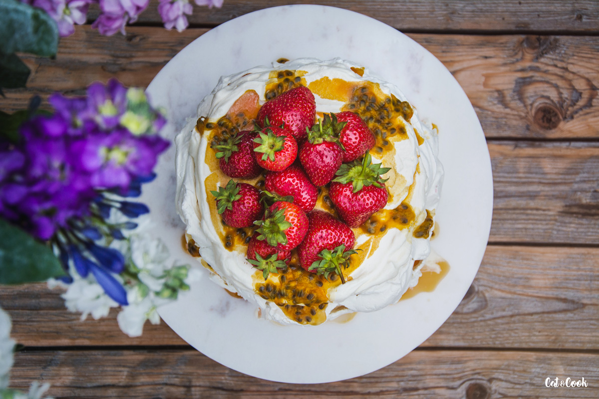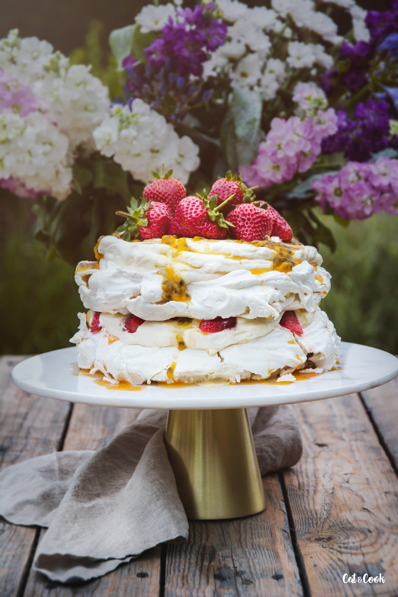 Až budou placky vystydlé, první opatrně přemístěte na dortový stojan či plochý talíř, promažte polovinou šlehačky a přidejte na plátky nakrájené jahody. Zalijte trochou mučenky a opatrně přikryjte druhou plackou. Ozdobte šlehačkou, mučenkou a celými jahodami. Při servírování můžete dort posypat moučkovým cukrem pro efekt. 🙂