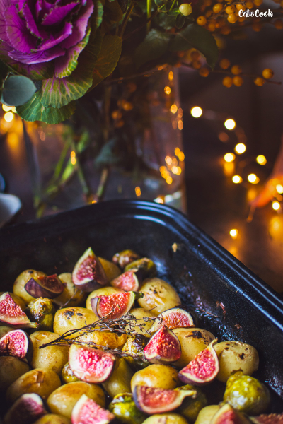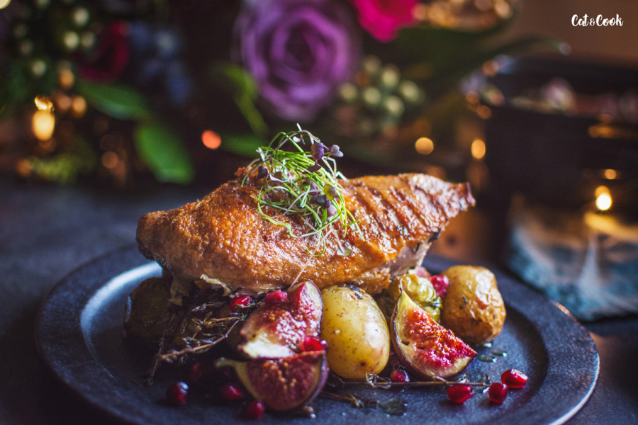 Kachnu umístěte prsní stranou dolů do velkého pekáče, zalijte 1/2 šálkem vývaru. Pečte asi 1,5 hodiny přiklopené ve střední části trouby. Vyjměte pekáč z trouby a přeneste kachnu na tác. Slijte tuk. Na pekáč umístěte brambory, kapustičky (pokud máte menší, přidejte je až po 25 minutách pečení) a zalije 1/2 šálkem kachního tuku. Přidejte trochu soli, pepře a tymián. Brambory nahrňte spíš ke krajům a vraťte kachnu na pekáč, prsy nahoru. Pečte, dokud brambory nejsou hotové a kachna hezky zlatavá. Bude to trvat si 45 – 60 minut. Po této době přendejte kachnu na prkénko, nechte ji odpočívat minimálně 10 minut a připravte si přílohu. K bramborám přidejte nakrájené fíky na čtvrtiny. Pečte, dokud fíky nejsou měkké a šťavnaté, asi 5 – 8 minut. Na závěr ozdobte mikro bylinkami a granátovým jablkem.