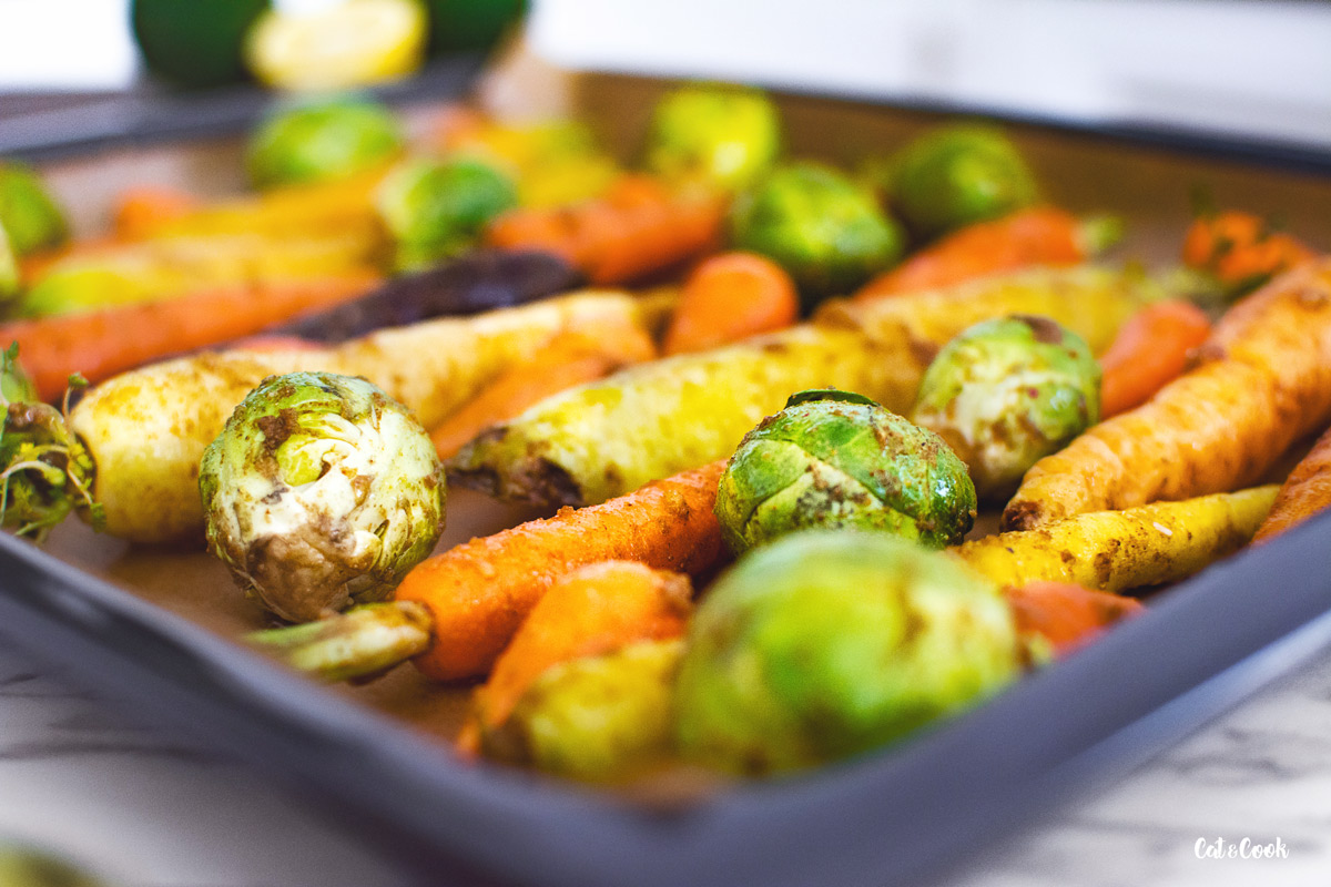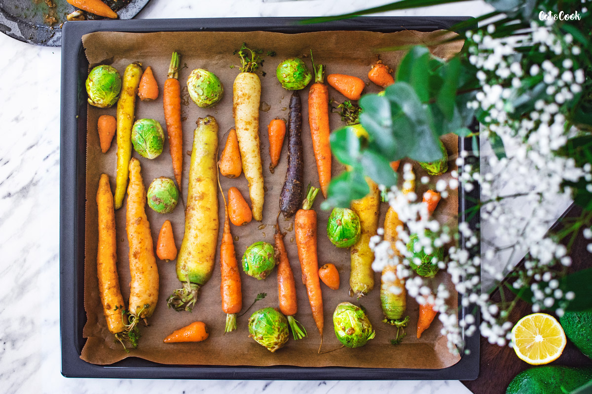 Mrkvičky vyrovnejte na plech pokrytý pečícím papírem a pečte v troubě asi 35 – 45 minut. Cílem je, aby byla zelenina pěkně opečená, ale stále lehce křupavá.