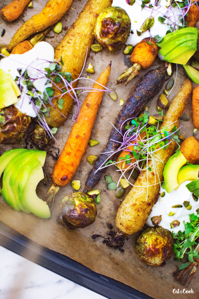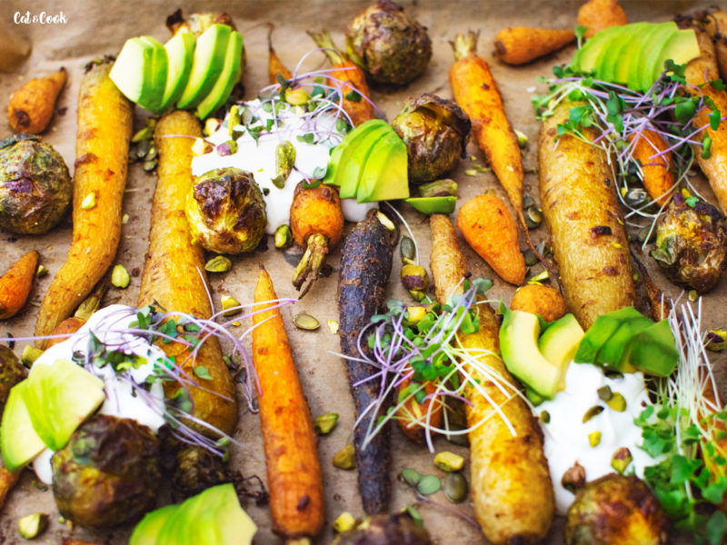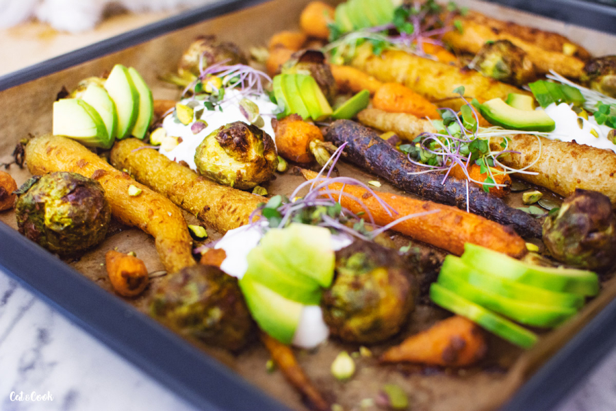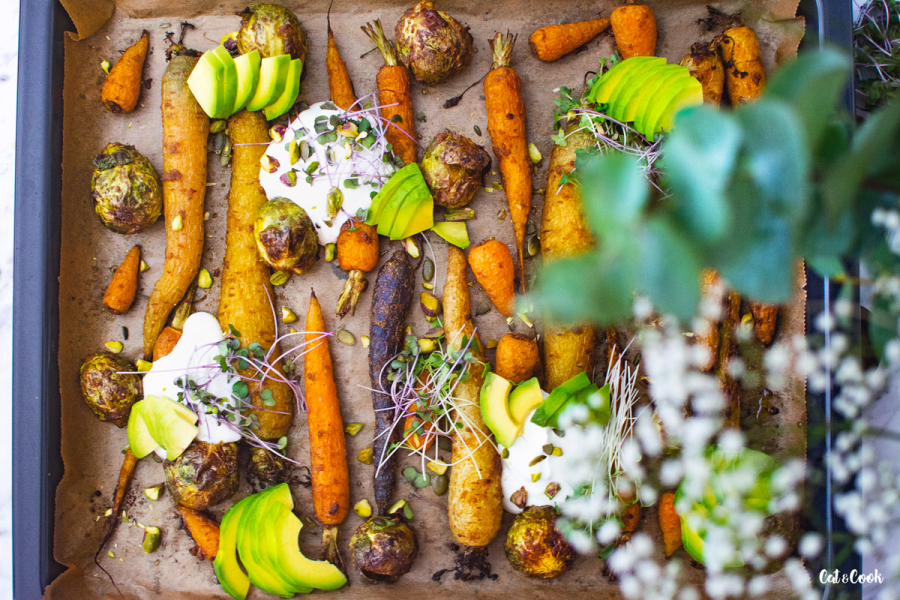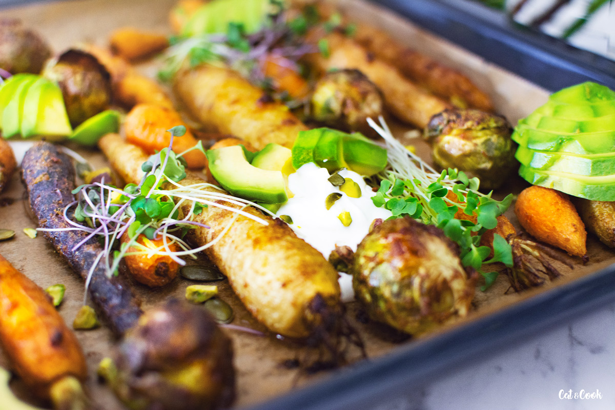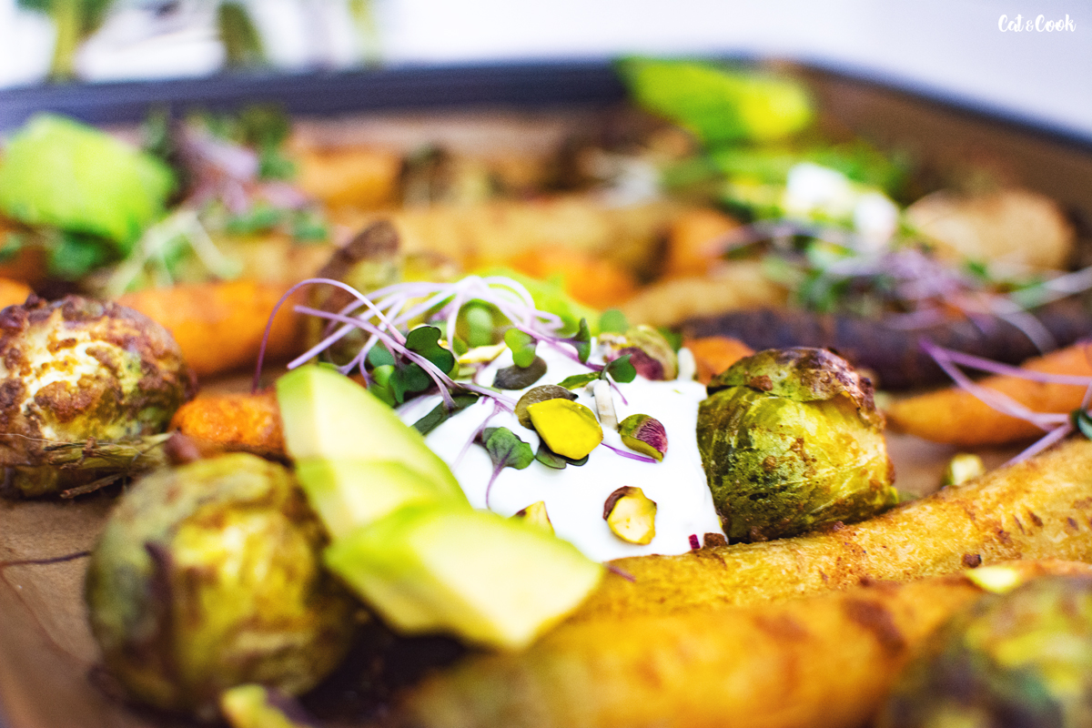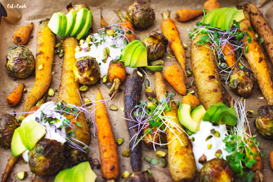 Hotovou zeleninu servírujte buď rovnou na plechu nebo ji rozdělte na talíře. Na každou porci přidejte osolený řecký jogurt (můžete do něj přidat i trochu rozmačkaného česneku), semínka, oříšky, avokádo a mikrobylinky.