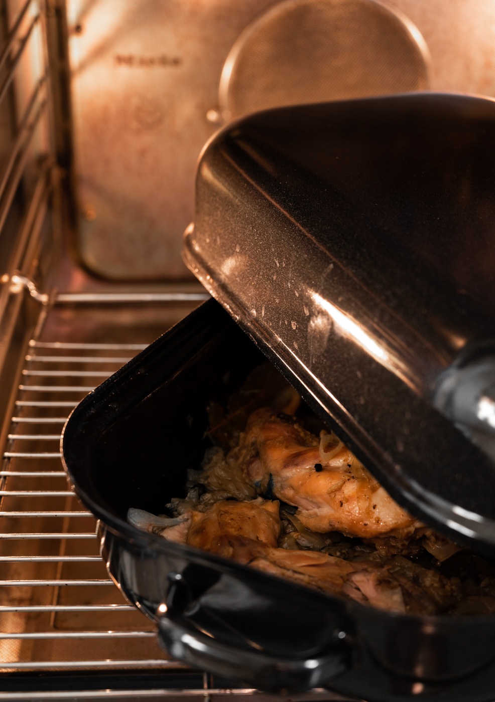 Troubu zapněte na 150 stupňů. Do pekáče, na který máte poklop rozprostřete cibuli a na ni položte máslo nakrájené na plátky. Dále do pekáče mezi cibuli vmáčkněte maso tak, aby ho cibulka hezky obklopovala. Přidejte nové koření, bobkový list a rozmarýn (pokud ho používáte). Nyní maso podlijte vývarem tak, aby bylo do ¼ až do ½ namočené. Přikryjte poklopem a vložte do trouby. Na 90 minut se o králíčka nemusíte starat. Po této době vyndejte pekáč a kousky králíka otočte – v žádném případě do něj ale nepíchejte, aby z něj zbytečně netekla šťáva. Pouze ho něčím podeberte, otočte a dejte přikrytý zpět do trouby. Zároveň si ohlídejte, aby byl králík dostatečně podlitý vývarem – už stačí jen do ¼. Po dalších 60 – 90 minutách vyzkoušejte, zda je masíčko měkké. Mělo by být jemné, vláčné, křehké a šťavnaté. Pokud ještě není, vraťte pekáč do trouby a pečte dalších 30 – 60 minut. 🙂