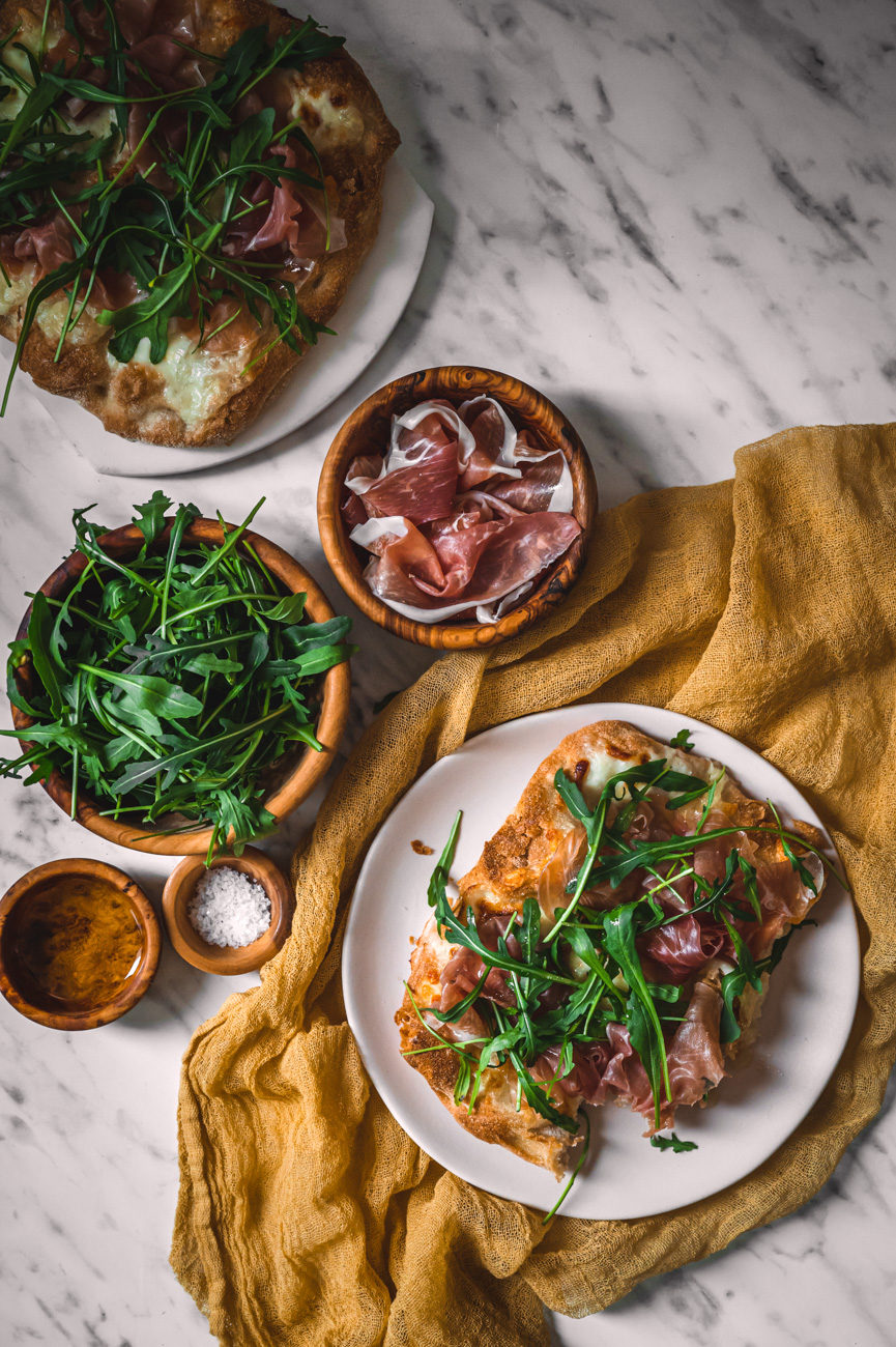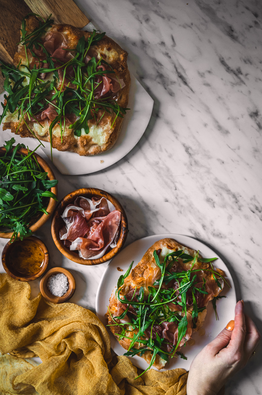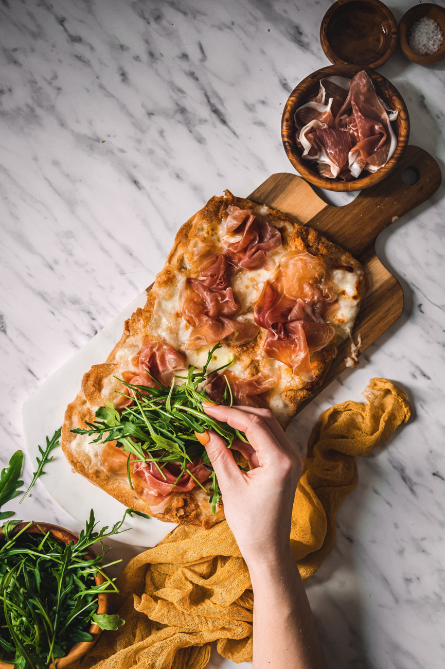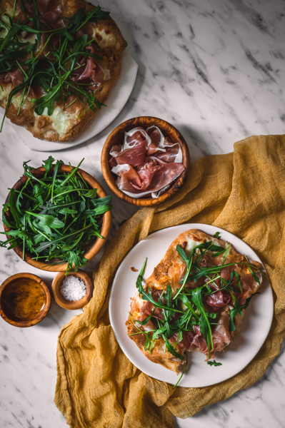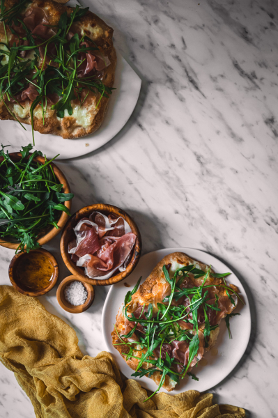 Troubu rozehřejte na 200 stupňů. Pinsu pomažte olivovým olejem a natrhejte na ni mozzarellu i stracchino. Vložte do trouby a pečte, dokud nebudou sýry krásně zlatavé, trvá to asi 15 minut. Až slaný pinsu vyndáte, poklaďte ji sušenou šunkou a rukolou. Zakápněte ještě lžící olivového oleje a podávejte. Pinsa je skvělá teplá i studená, záleží na vaší chuti. 🙂