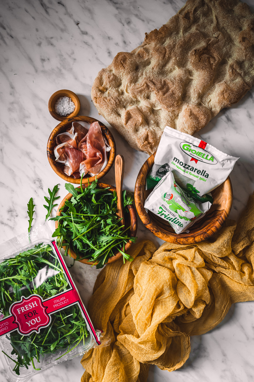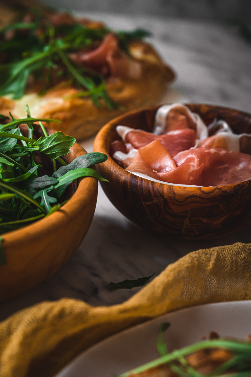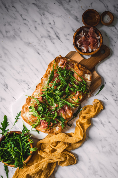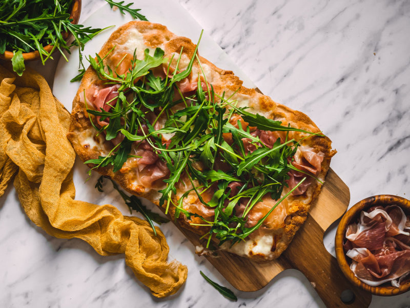 Troubu rozehřejte na 200 stupňů. Pinsu pomažte olivovým olejem a natrhejte na ni mozzarellu i stracchino. Vložte do trouby a pečte, dokud nebudou sýry krásně zlatavé, trvá to asi 15 minut. Až slaný pinsu vyndáte, poklaďte ji sušenou šunkou a rukolou. Zakápněte ještě lžící olivového oleje a podávejte. Pinsa je skvělá teplá i studená, záleží na vaší chuti. 🙂