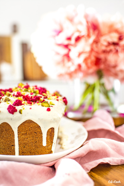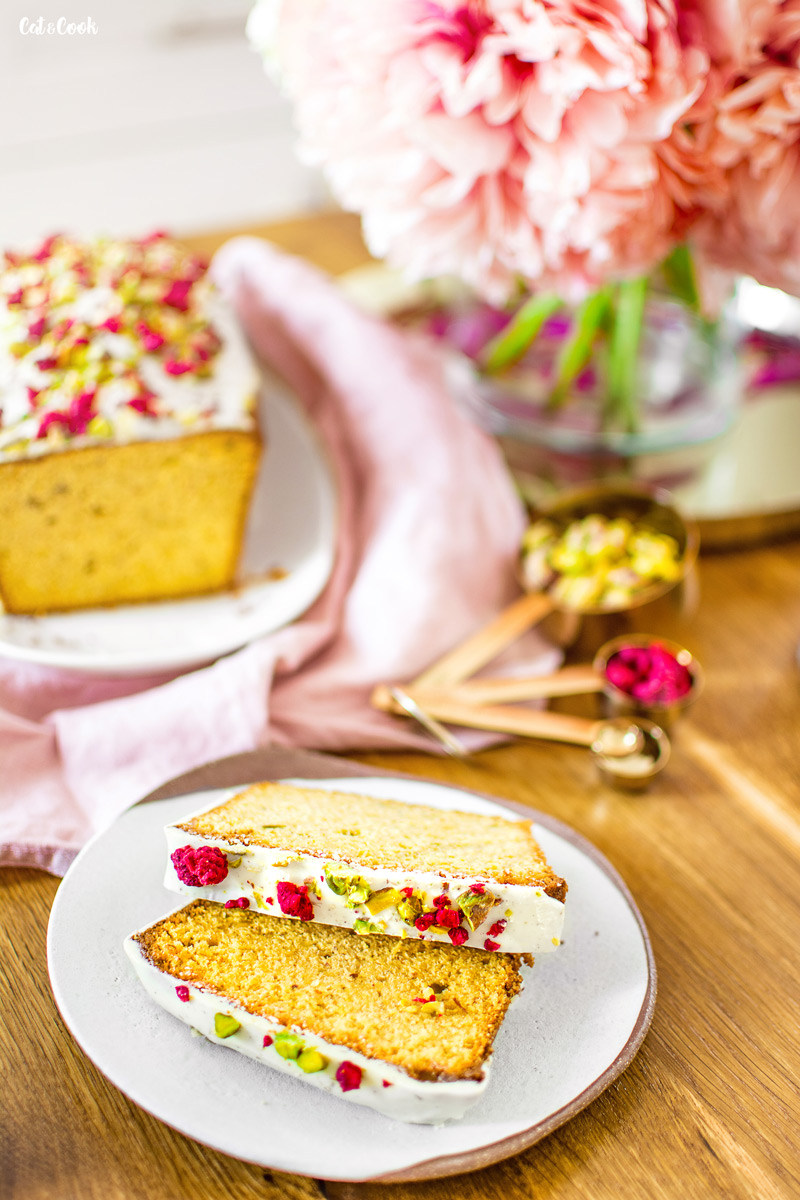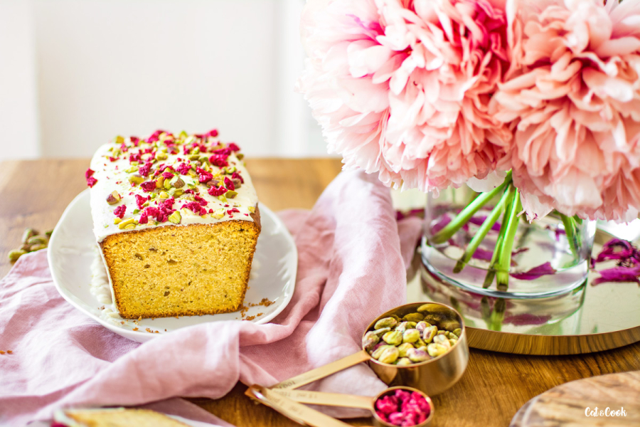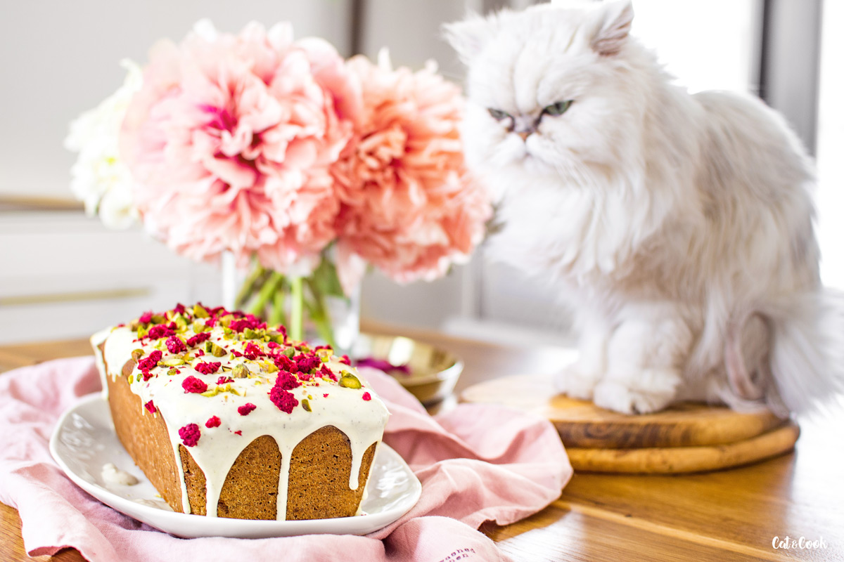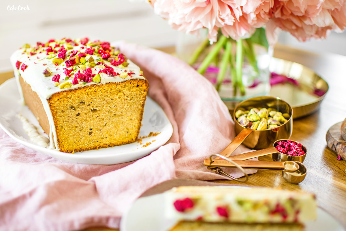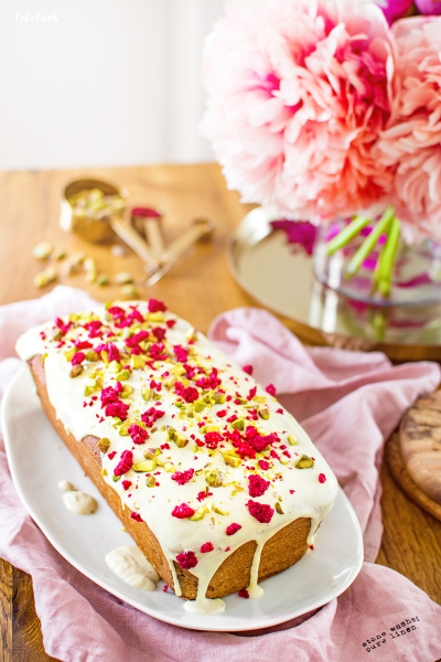 Mezitím si ve vodní lázni rozpusťte čokoládu a počkejte až trochu zchladne (přitom ji promíchávejte stěrkou). Čokoládu nalijte podélně doprostřed chlebíčku a stěrkou nebo lžící čokoládu opatrně hrňte k okrajům. Čokolády nepouštějte přes hranu zbytečně moc, aby nestekla až úplně dolů. Hned, jak budete mít hotovo, posypte ještě malinami a sekanými pistáciemi. Nakonec dejte chlebík alespoň na 15 minut do lednice a poté můžete podávat. Já jsem ho mazala úžasným vanilkovo – rebarborovým krémem z M&S a bylo to dokonalé!