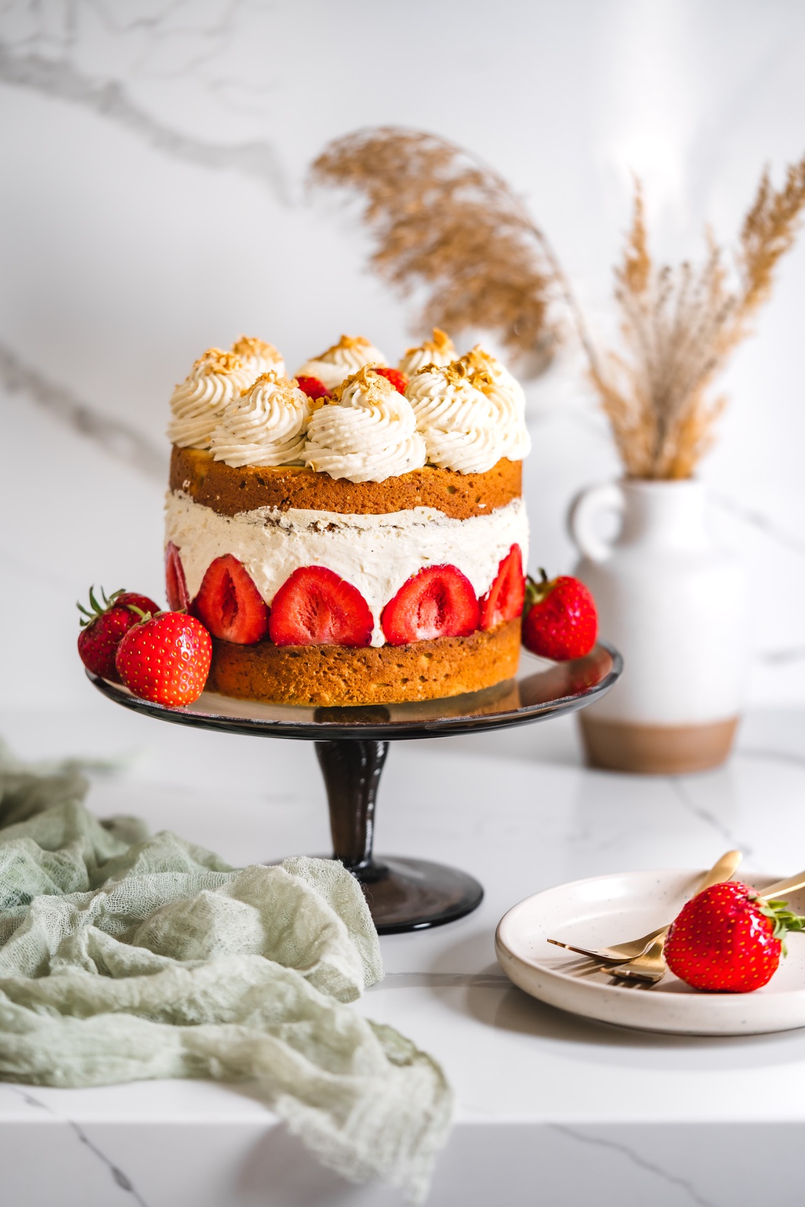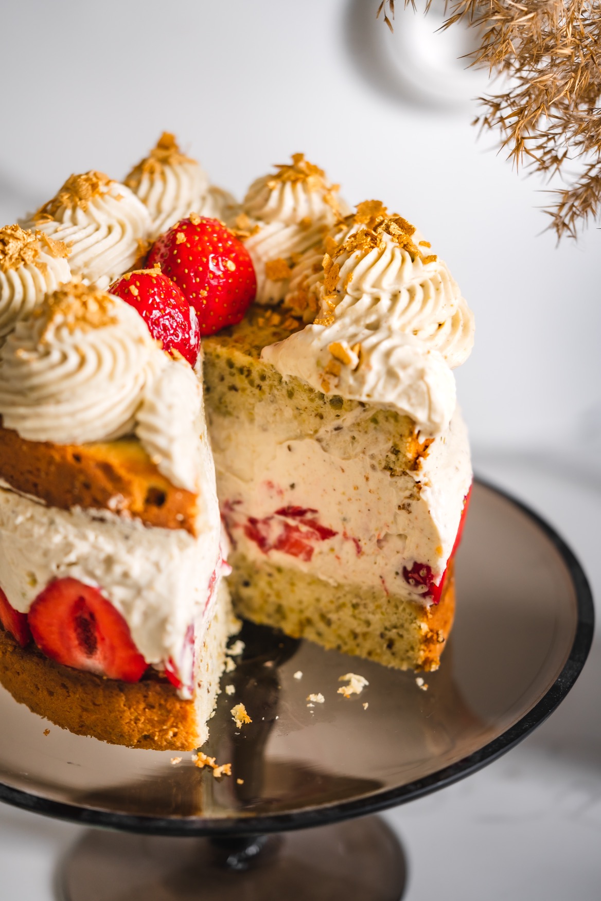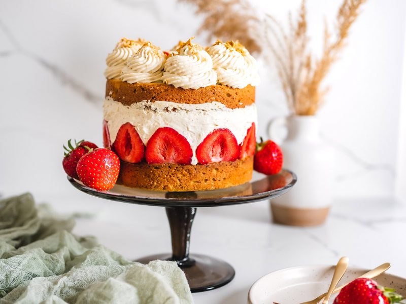 Následující den dort ozdobte zbylým krémem a jahodami. 🙂 Odstraňte formu i fólii a přeneste na dortový stojan. Krájejte ho velmi opatrně, aby krém nevyjížděl ze stran.