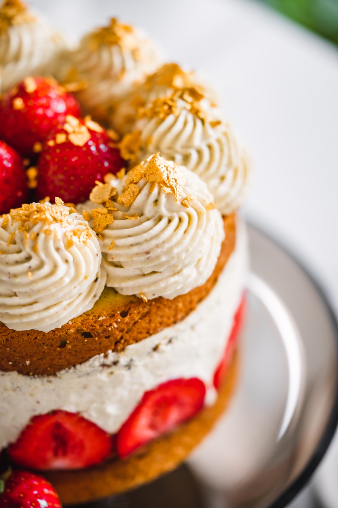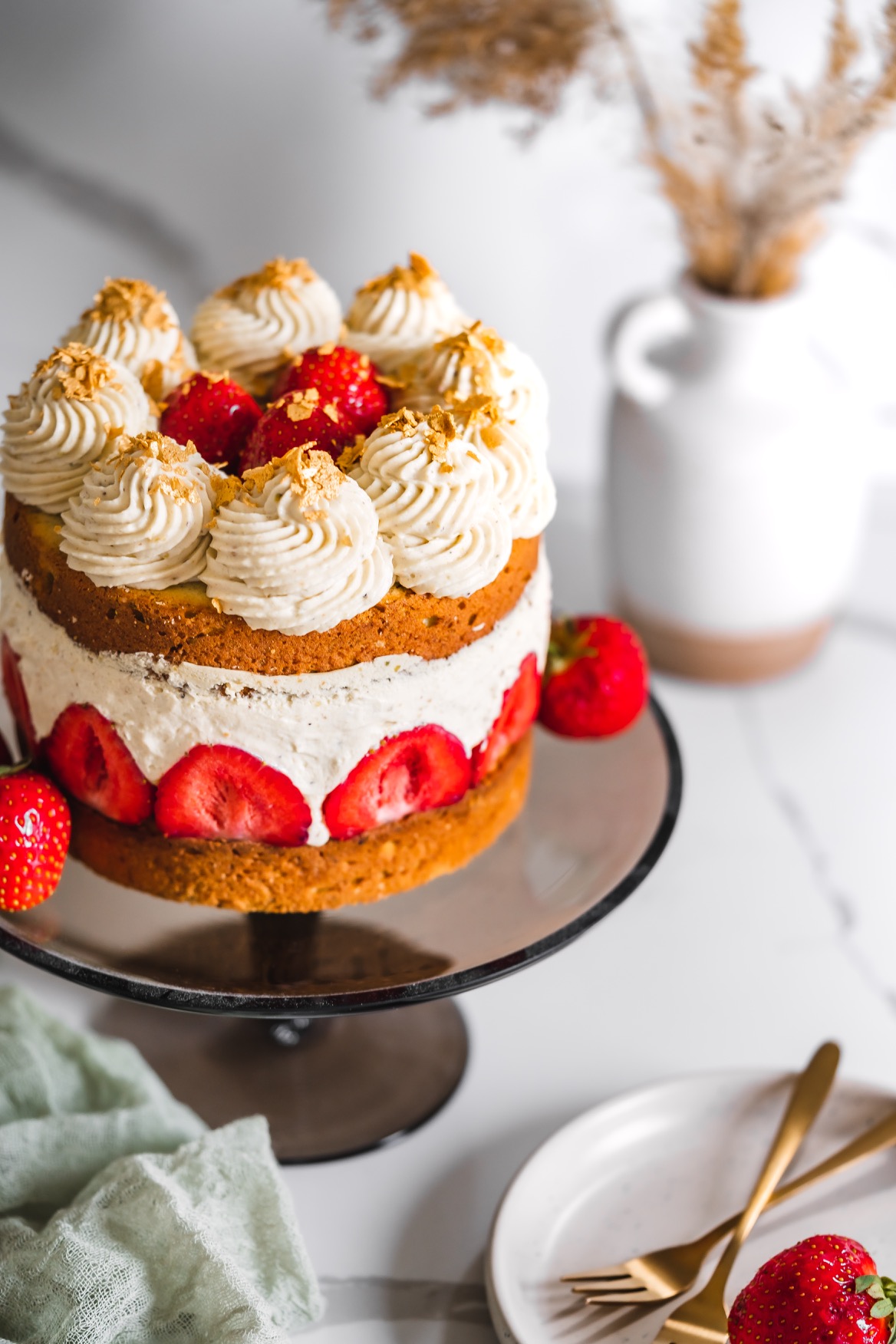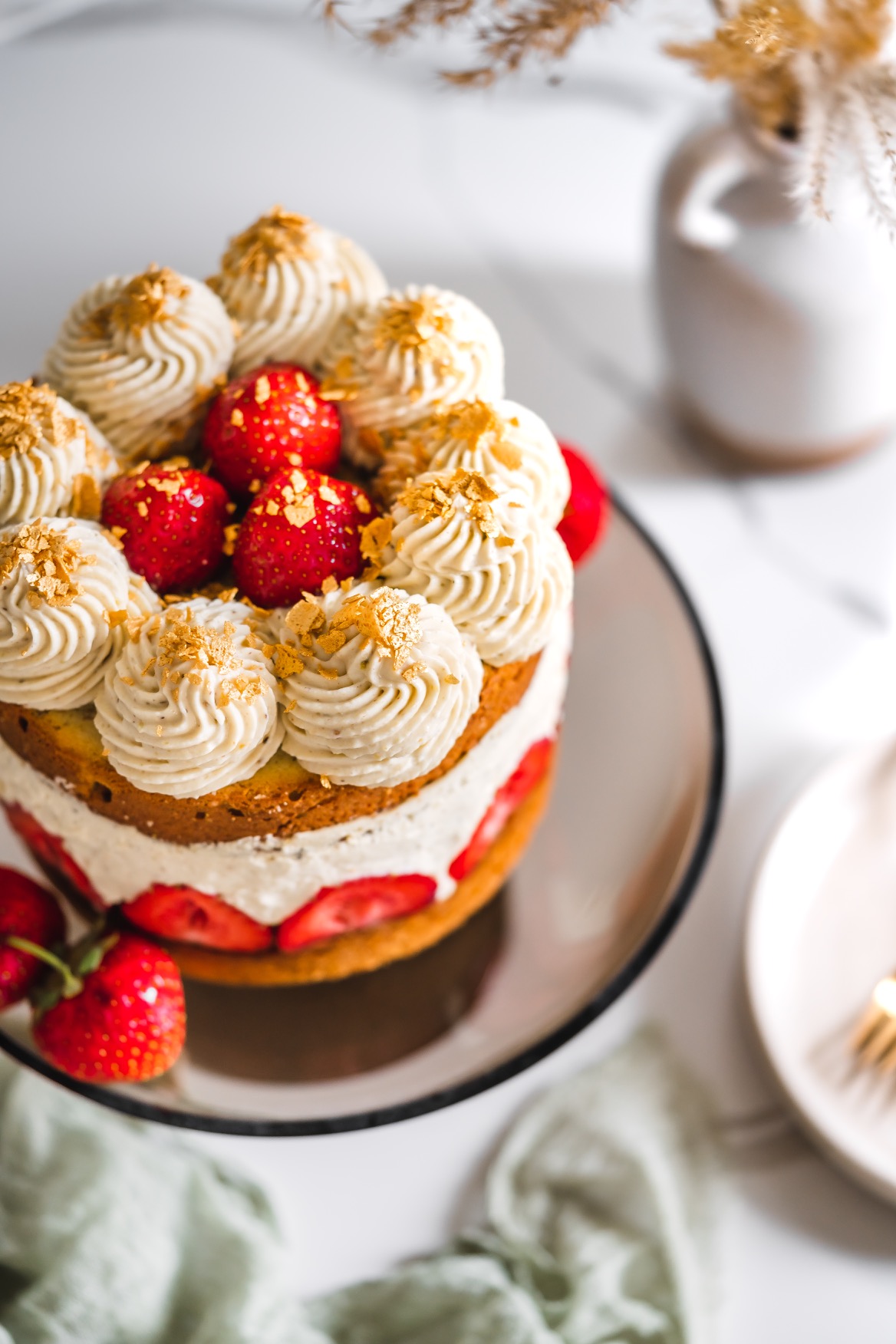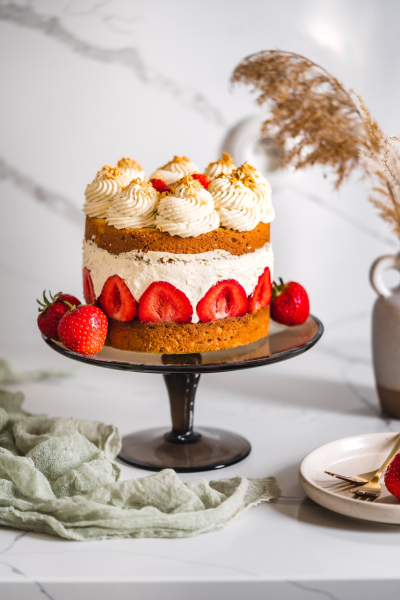 Že v šestinedělí zvládnu dort, to bych nikdy neřekla. Ale mám z toho radost, Leuška mi spinkala v nosítku a já mohla v klidu péct a zdobit. 🙂 Sice je to dort takový rustikální, ale na chuti mu to neubírá! Bude skvělý jak s jahodami, tak s malinami. A předem upozorňuji, že při krájení musíte být opatrní, protože krém není ničím ztužený. Já totiž nemám ráda ztužovače ani želatiny v krémech, proto pokud to jen jde, vynechávám je. Ale pokud si chcete být jistější, určitě si krém můžete něčím ztužit. 🙂