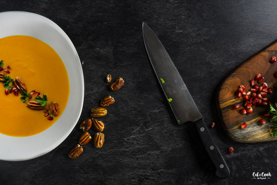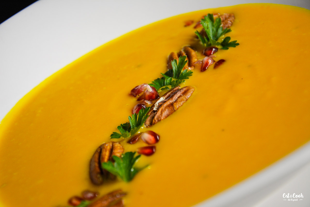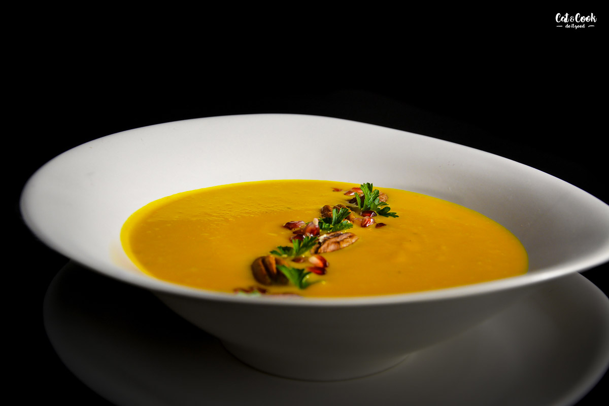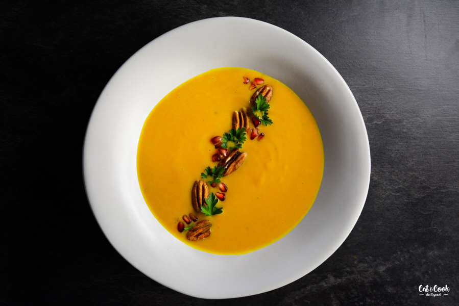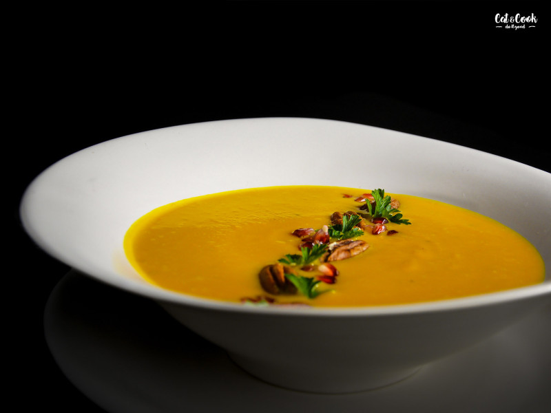 V servírování polévky se meze nekladou. Stačí ji ozdobit smetanou a nasekanou petrželkou nebo lze přihodit ořechy či různá opražená semínka, včetně těch dýňových 🙂 Já to střídám, někdy mám chuť na granátové jablko s pekanovými ořechy a někdy preferuji klasiku jen s petrželkou 🙂
