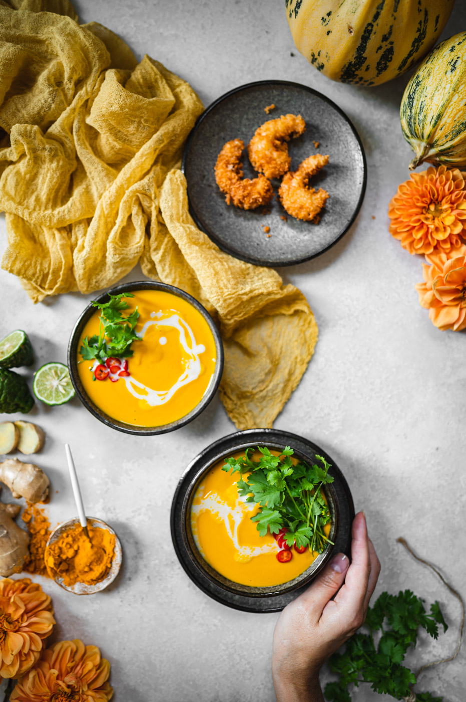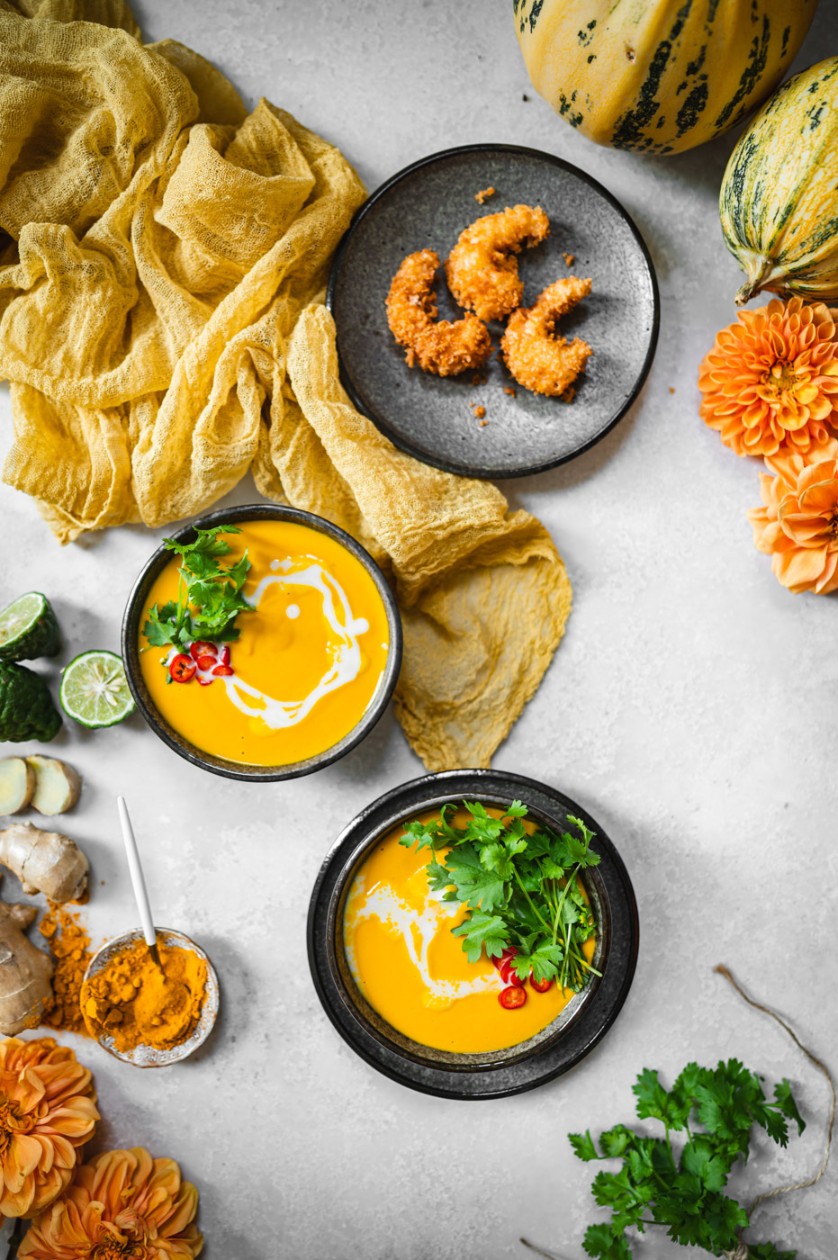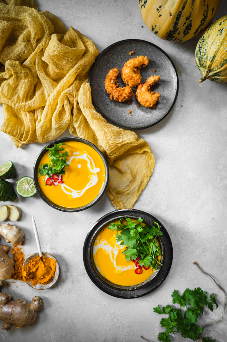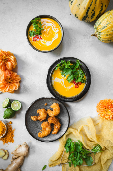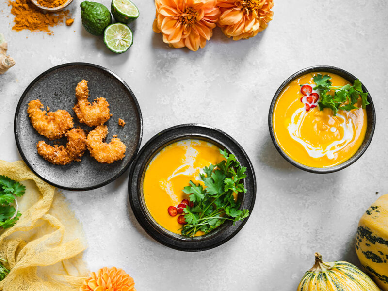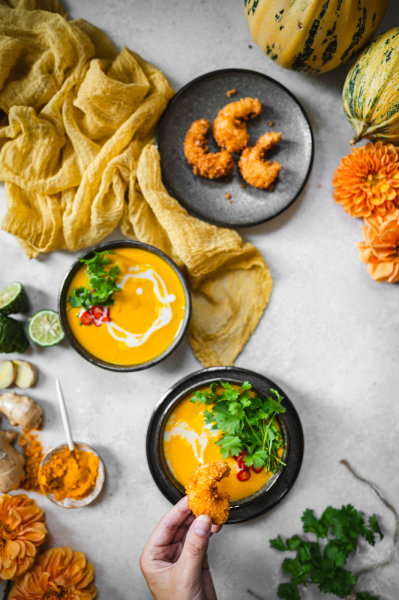 Musím říct, že tohle je asi moje nejoblíbenější příprava dýňového krému! V první řadě je skvělé upéct dýni v troubě, protože tam má možnost krásně zkaramelizovat, což zajistí skvělou chuť. Zároveň použití kari pasty, zázvoru a kurkumy zajistí exotickou, ostřejší chuť, která dýni rozhodně svědčí! 🙂 Kokosové mléko pálivost lehce zmírní a limetka dodá svěžest. Zkrátka dokonalá kombinace.