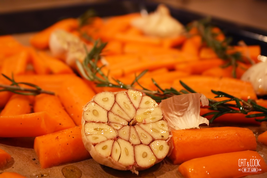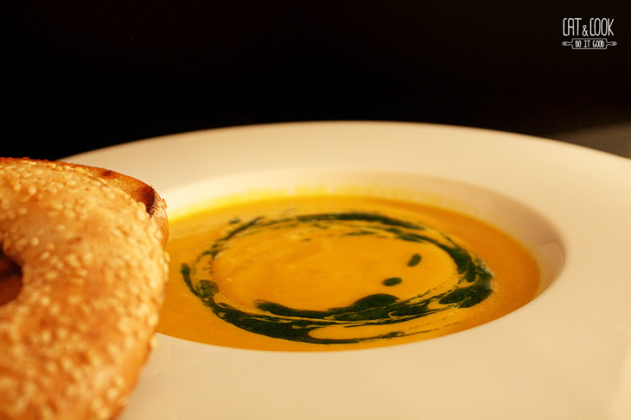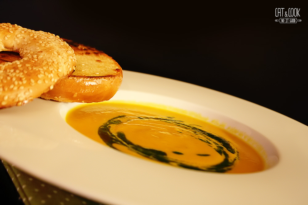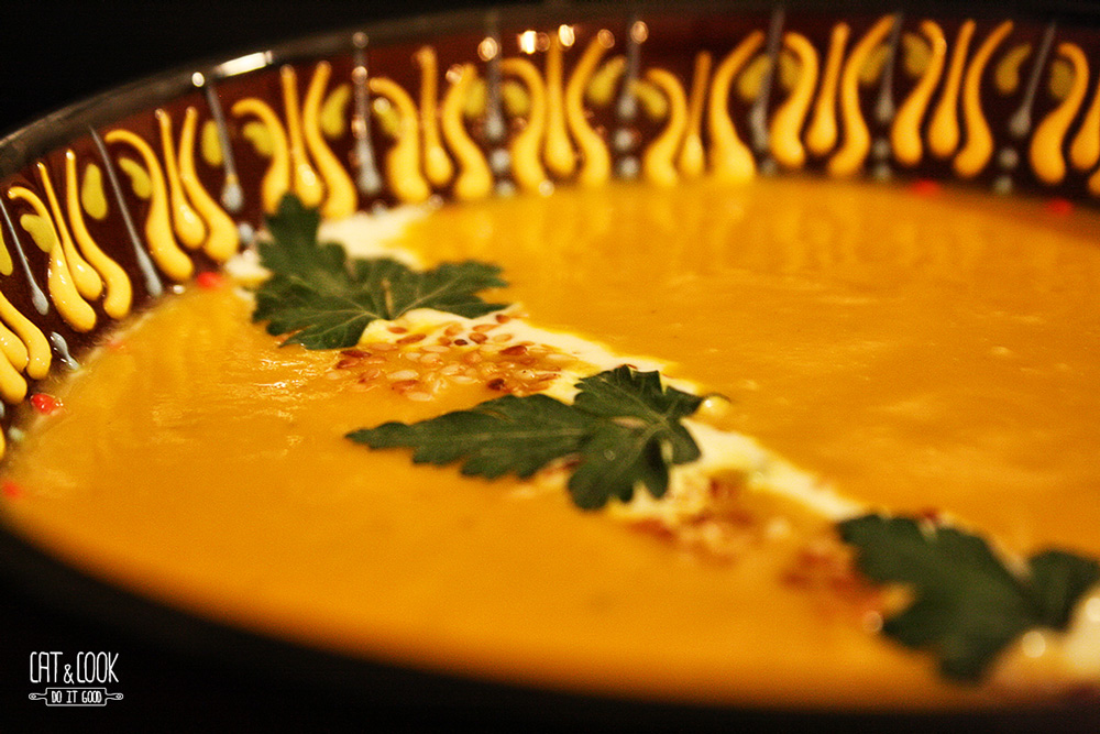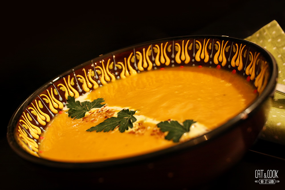 Opečenou mrkev vyndej z trouby, přidej k cibuli a zalij vývarem (přidej pouze část a poté dolívej do požadované hustoty). Palici česneku vymačkej do směsi, přilij asi 100ml šlehačky a společně rozmixuj tyčovým mixérem. Dej pozor, aby se do směsi nedostaly dřevnaté části z bylinek, lístky nevadí, ba naopak. Polévku osol, případně opepři a přeceď do jiného hrnce. Prohřej a servíruj. Já k tomu mám ráda pečivo opečené na másle. Polévku můžeš ozdobit téměř čímkoliv – opraženým sezamem, piniemi, petrželovým olejem (tyčovým mixérem rozmixuješ petrželku v troše olivového oleje), smetanou atd. Jen pamatuj, že všeho s mírou, protože nechceme přebít chuť mrkvičky 🙂