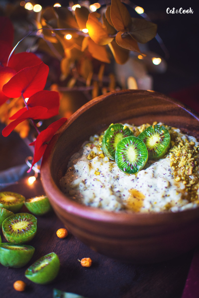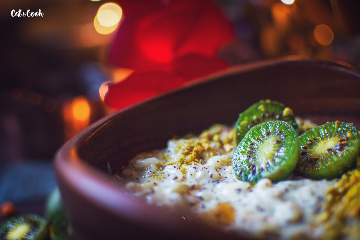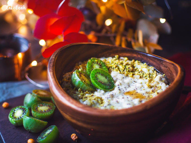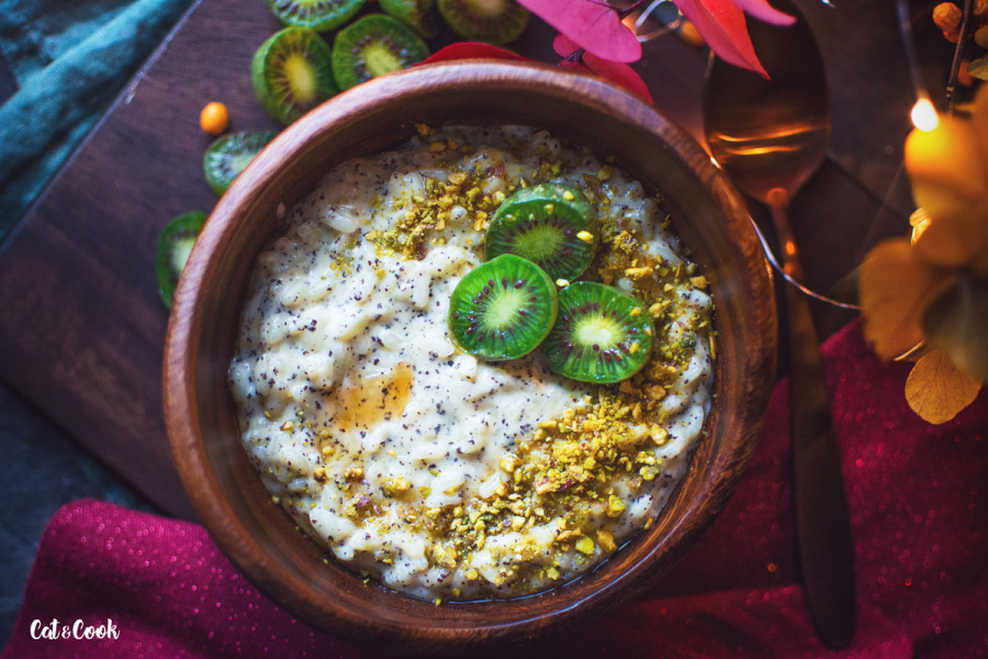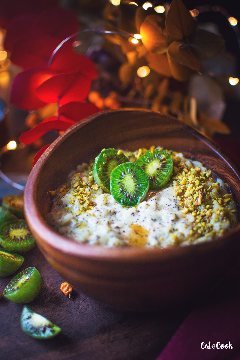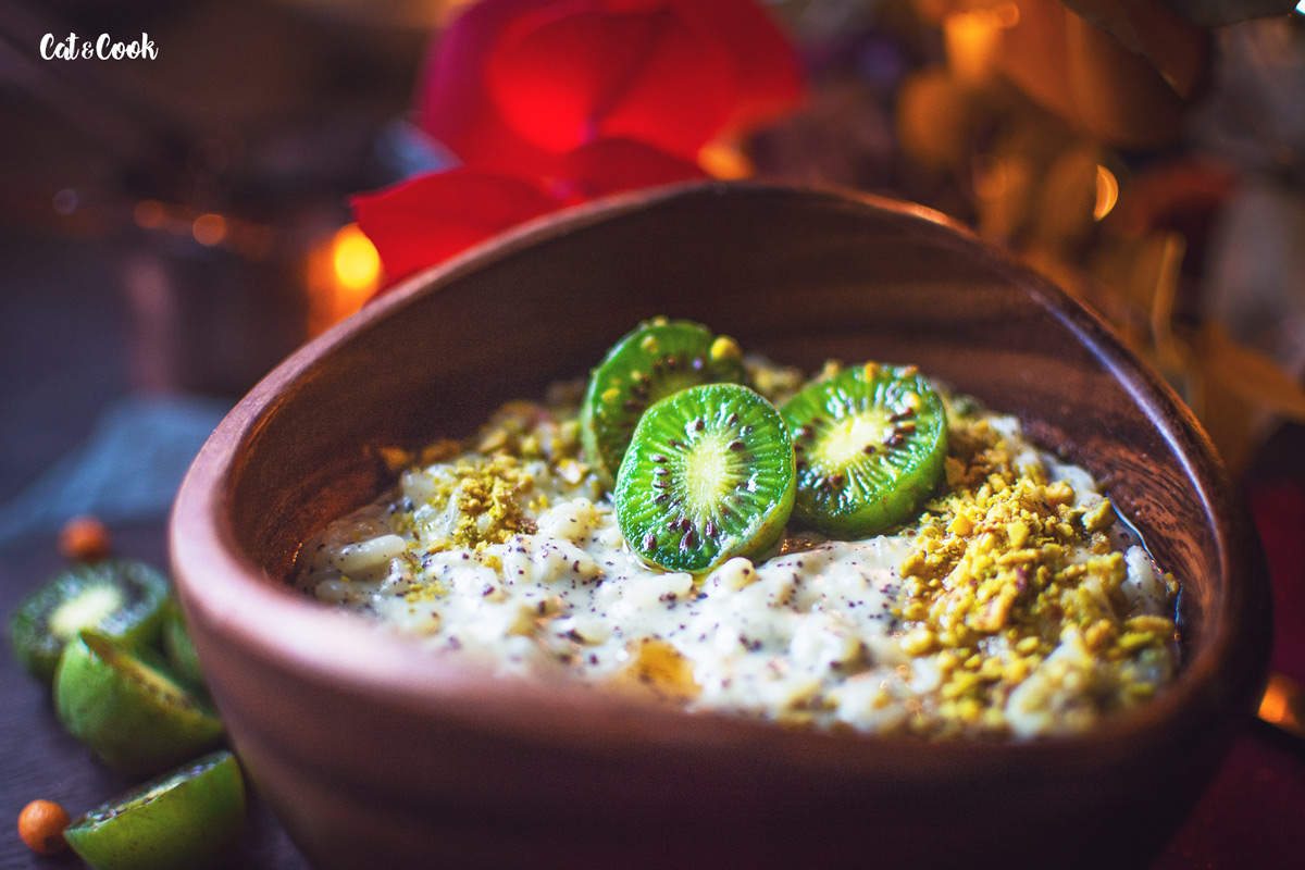 Rýží naservírujte do misky, oslaďte javorovým nebo datlovým sirupem (pokud je potřeba) a přidejte své oblíbené ovoce, oříšky nebo čokoládu 🙂 Záleží na vaší chuti, doporučuju ale nepřehánět to s přísadami – kaše je naprosto úžasná od základu díky koření, máku a smetaně <3 Já jsem zvolila baby kiwi a trochu pistácií.