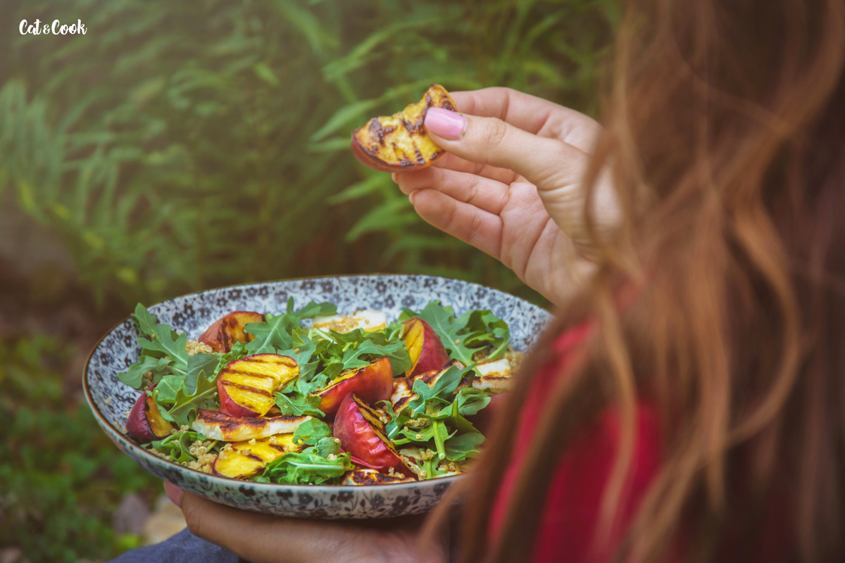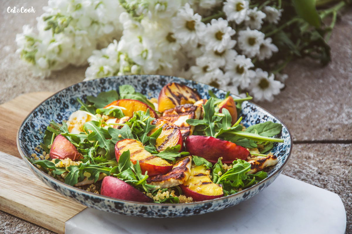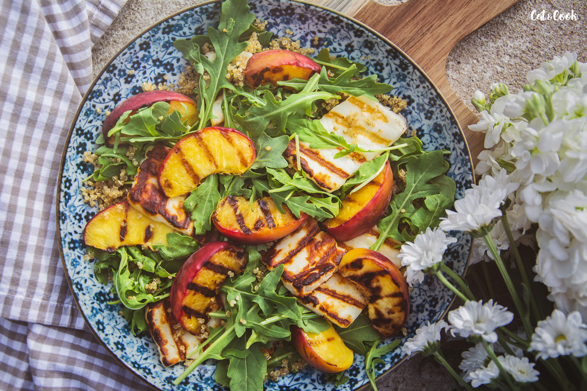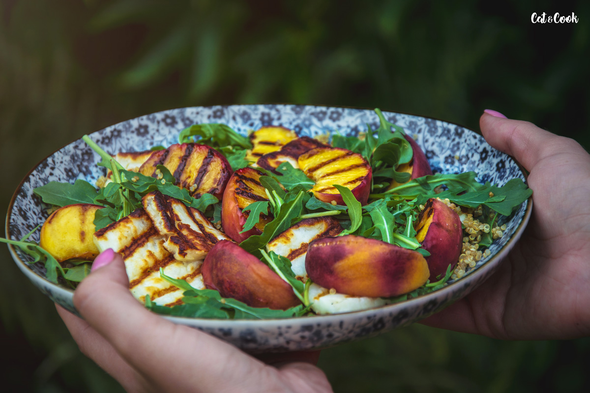 Kdo viděl předpověď, ví, že nás čekají horké dny! Není lepší příležitost, než vytáhnout gril a udělat si nějaký super dobroty 🙂 Zkuste tento netradiční salát s grilovaným sýrem a broskvemi.