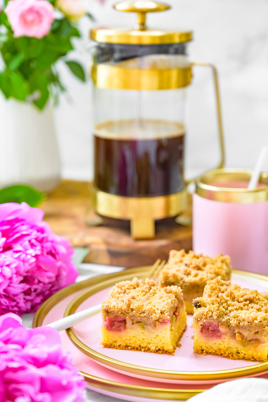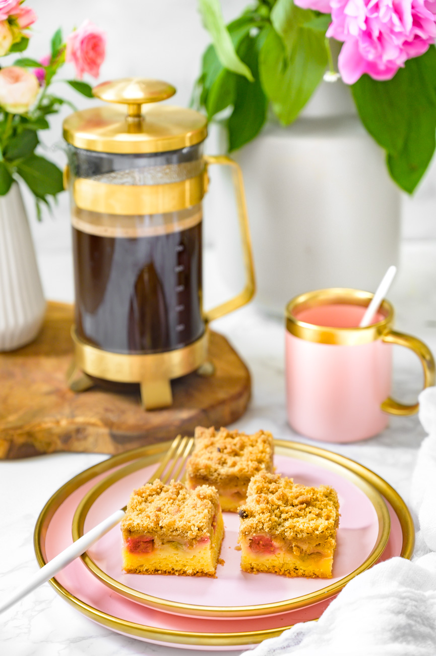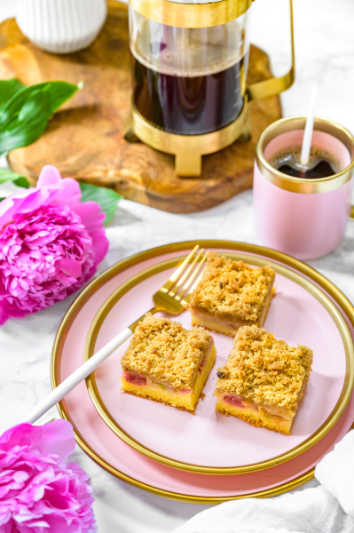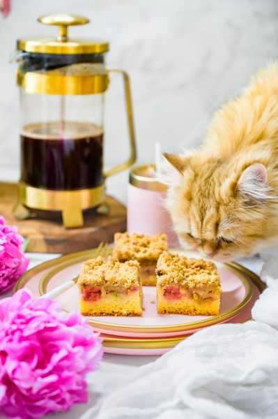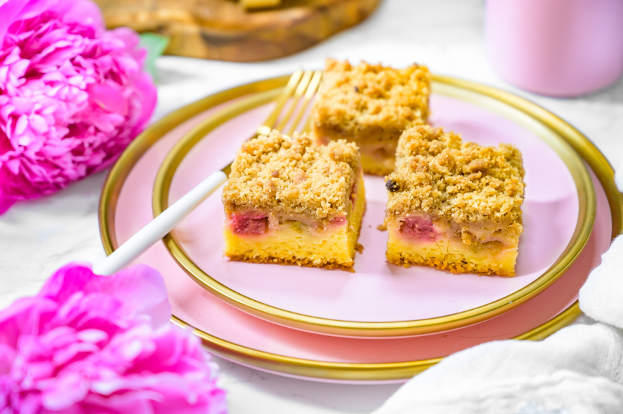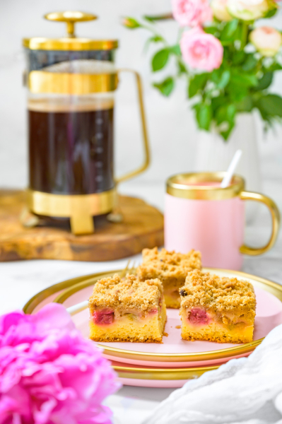 Vložte do středu trouby a pečte 40 – 50 minut – záleží na vaší troubě, je potřeba to kontrolovat pomocí špejle. Důležité je, abyste koláč zbytečně nepřepekli, protože ho tím vysušujete. Zároveň počítejte s tím, že špejle po vytažení bude díky rebarboře vždy „vlhká“, proto je nutné zkontrolovat, zda je špejle vlhká od těsta nebo rebarbory. :-)Pokud bude jen od rebarbory, hned koláč vytáhněte a nechte vychladnout (to je ta nejtěžší část).
