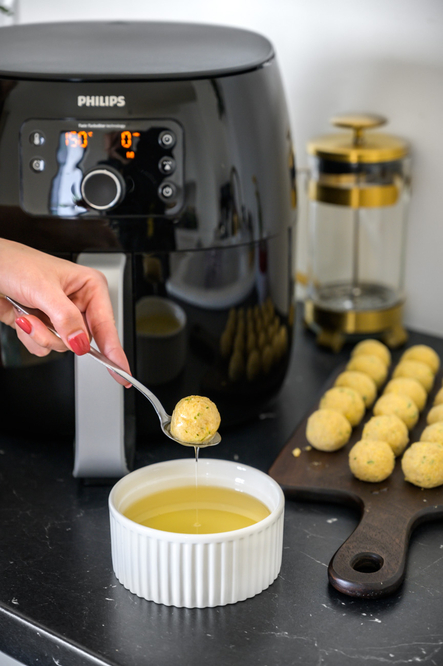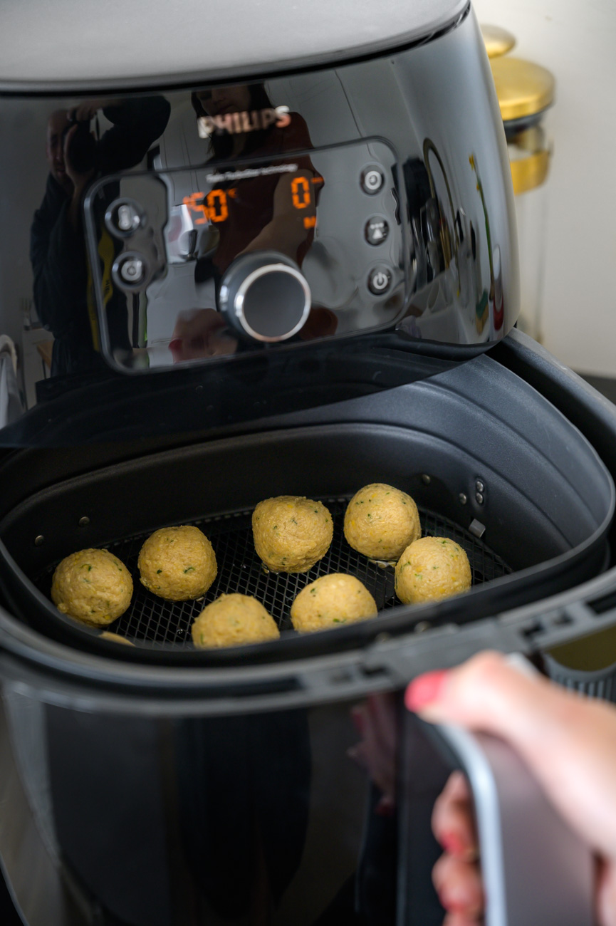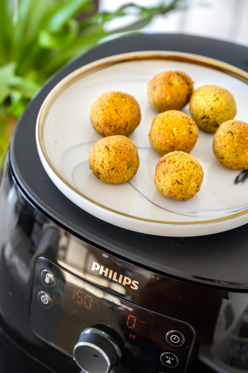Fritézu Airfryer předehřejte na 160 stupňů. Připravené kuličky namočte do oleje – jde to dobře pomocí lžičky, nechte je řádně okapat, aby na nich zůstala jen tenoučká vrstva a položte do fritovacího koše. Fritézu nastavte na 14 minut a zavřete ji. Každých 5 minut kuličky pootočte. Pokud chcete olej úplně vynechat, není to problém, jen nedocílíte typické zlatavé „kůrky“ na povrchu falafelu.