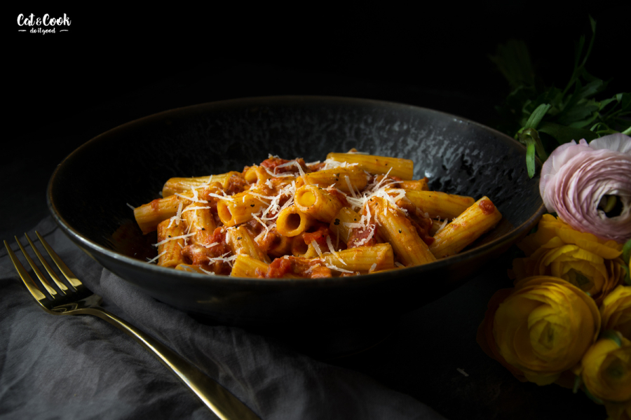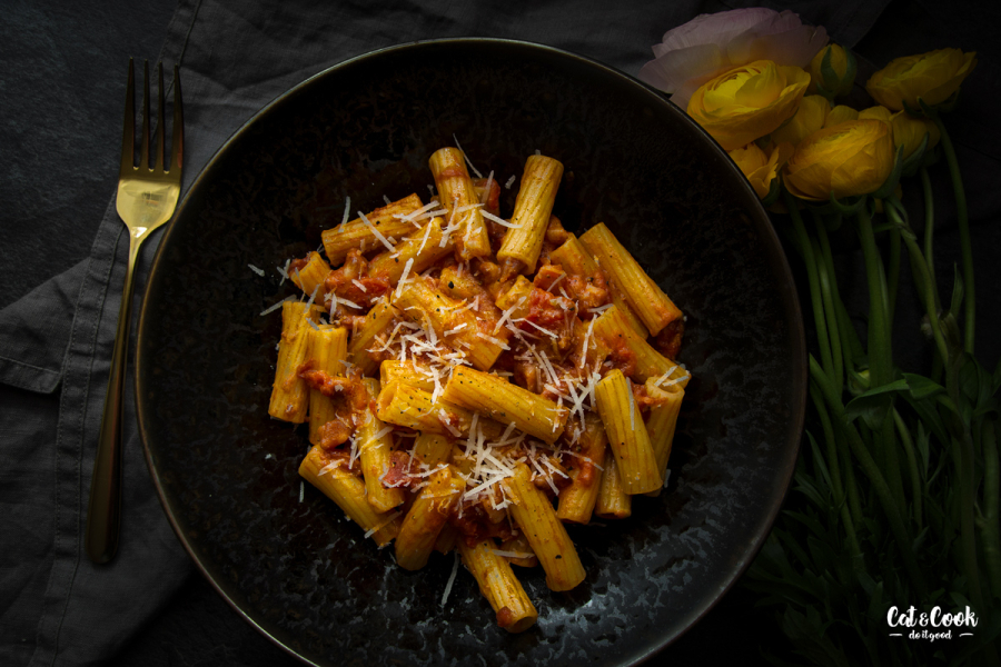 Když nepočítám carbonary, je to moje nejoblíbenější italská omáčka! Původní název byl griscia od vesničky Grisciano, kde je místní pastýři začali jako první připravovat, tehdy ještě bez rajčat. Lidé v městě Amatrice přidali rajčata a omáčka amatriciana byla na světě 🙂 Tohle všechno se událo už na konci 17.století!