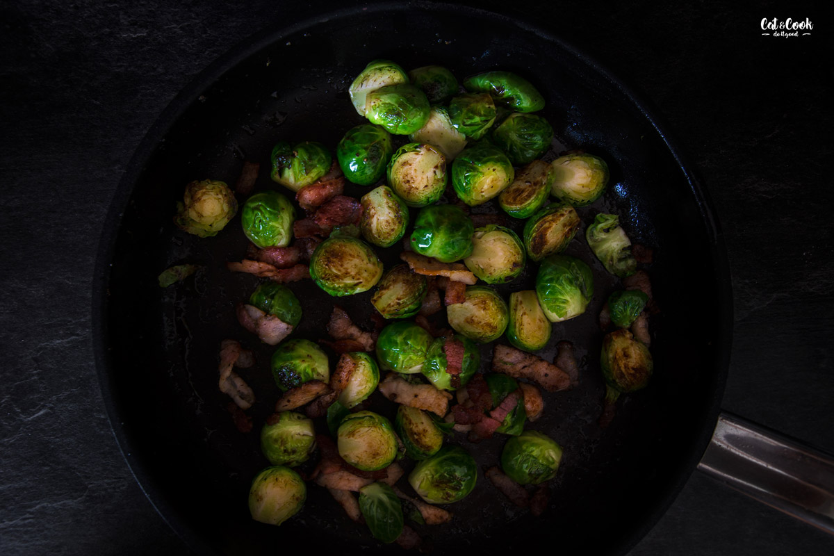 Slaninu nakrájejte na menší proužky. Pánev rozehřejte na střední stupeň. Přidejte jednu lžíci olivového oleje a 30 g másla. Vhoďte slaninu a opékejte skoro dozlatova. Růžičky kapusty přepulte a přidejte do pánve. Osolte, opepřete a opékejte asi 2 – 3 minuty, dokud kapusta nebude svěže zelená. Sundejte z plotny a podávejte.