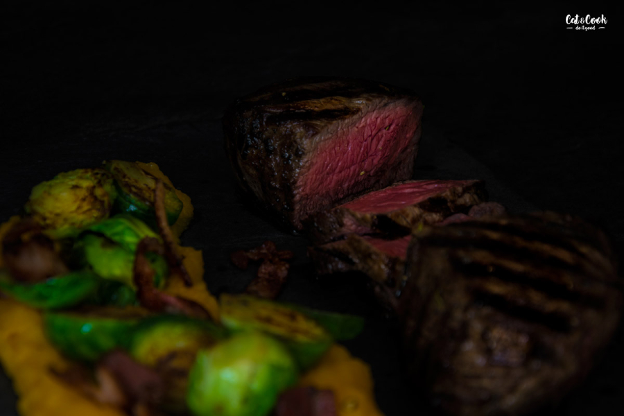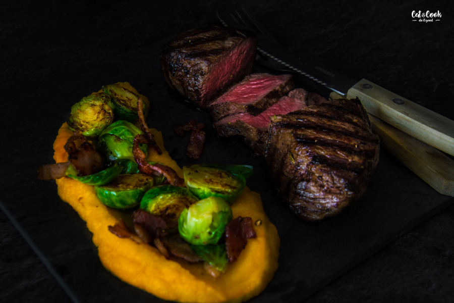 Na talíř naservírujte pyré, kapustu a steak. Steak můžete polít máslovou šťávou, která vznikla při jeho opékání.