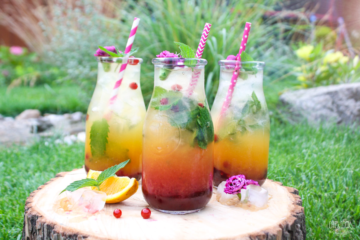 Do 4 nebo 6 menších sklenic rozděl nejdřív pyré, přidej led, mátu, opatrně přilij pomerančovou šťávu, na ni po lžičce bílý rum a dolij vodou. Nakonec ozdob podle libosti a podávej s nějakým fešným brčkem 🙂
