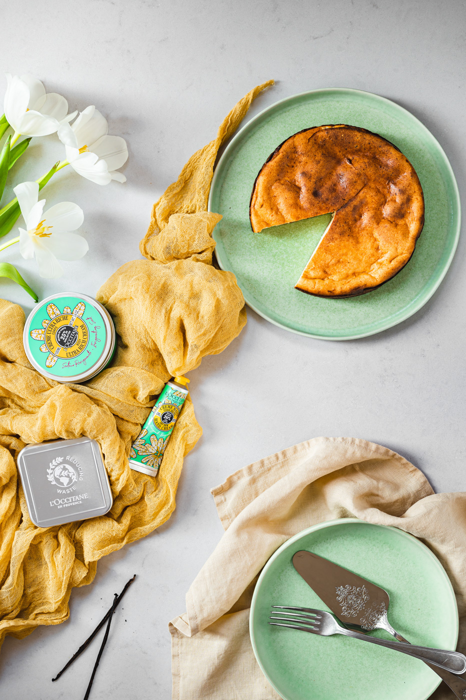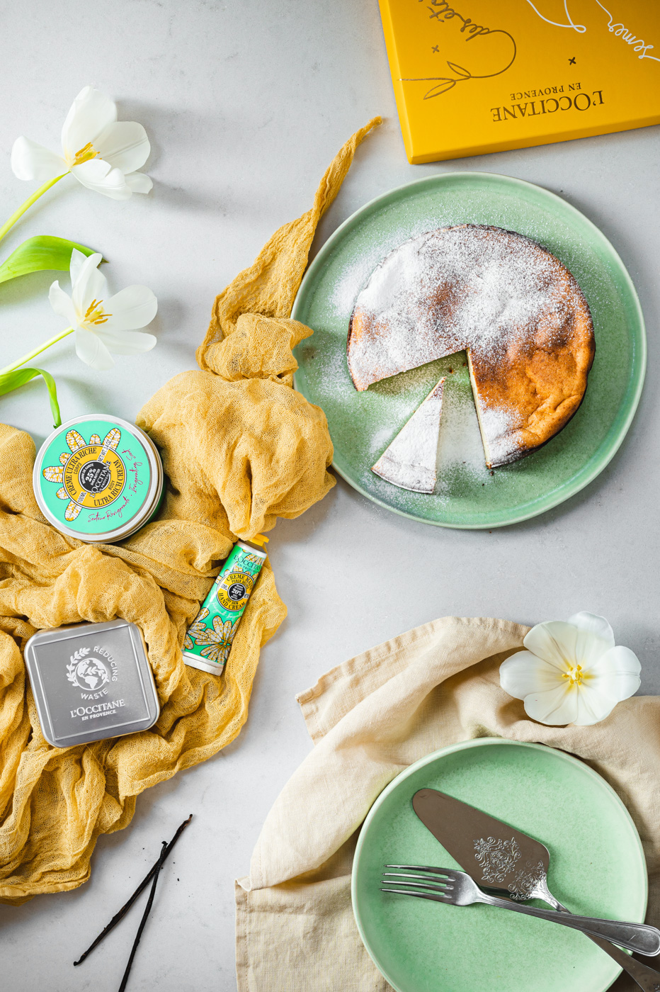 Tento recept na koláč mi nedávno nadiktovala babička přes telefon. Od té doby jsem vyzkoušela další tři verze – s máslem, smetanou, pečený ve vodní lázni atd., abych se zpět vrátila k prosté klasice! Ne, že by ty složitější verze nebyly dobré…, ale zkrátka u tohoto koláče je nejintenzivněji cítit chuť tvarohu. Nafotila jsem ho v rámci spolupráce s mým oblíbeným L`occitane, tak se nelekněte produktů u fotek. 🙂 Jejich nová řada má údajně patentovanou povzbudivou vůni a v kombinaci s koláčem, který vás povzbudí svou rychlou přípravou je to celkem sranda! 😀