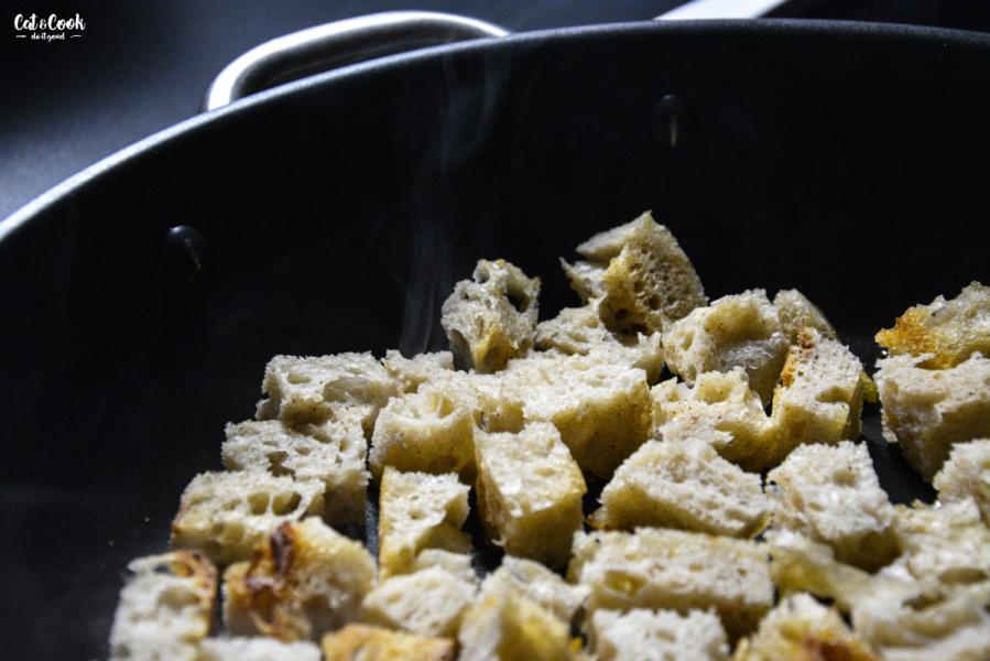 Kůrky od chleba odkroj a vnitřek nakrájej na cca 2 cm kostky. Rozpal si pánev a nalij na ni asi 2 lžíce olivového oleje. Přidej nakrájený světlý chléb a opeč dozlatova. Nakonec přidej 2 lžíce čerstvě strouhaného parmezánu. Sundej z plotny a nech stranou.