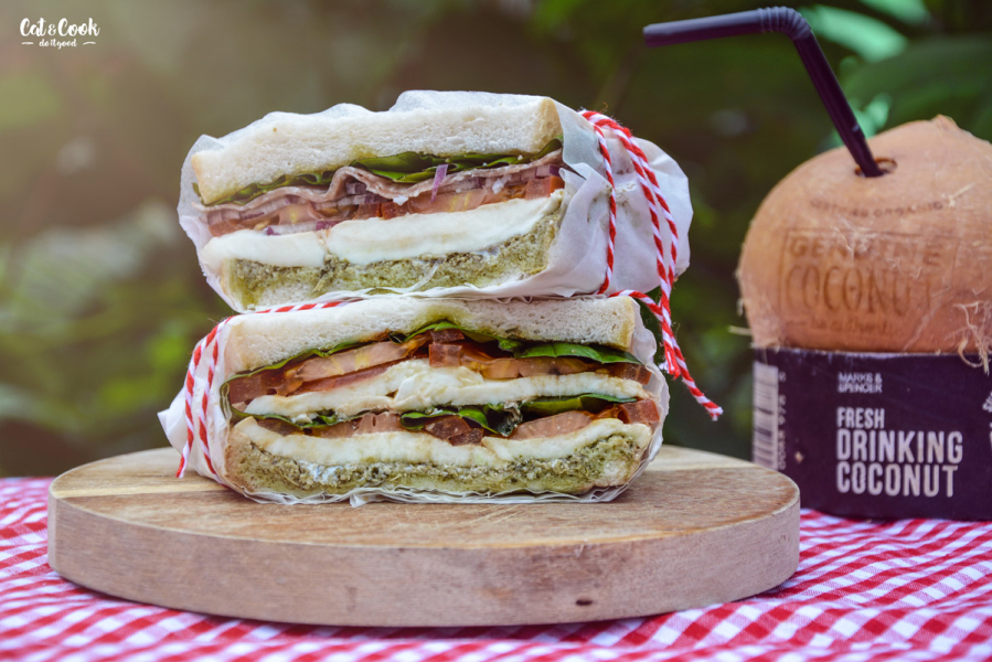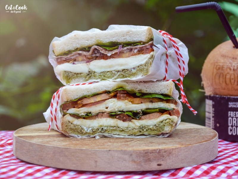 Cibuli nakrájejte na slabá kolečka. Mozzarellu a rajčata rozkrájejte na plátky. Mozzarellu osolte. Sendvičový chléb namažte bazalkovým pestem a vrstvěte postupně mozzarellu, rajčata, bazalku, italský salám a cibuli. Pokapejte olivovým olejem. Nakonec přikryjte plátkem sendvičového chleba, obalte pečícím papírem a ovažte provázkem.
