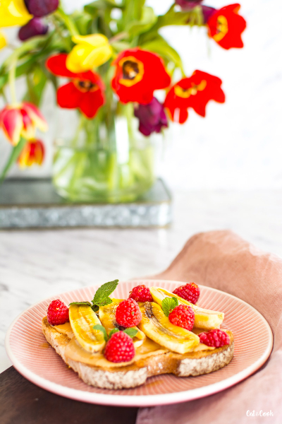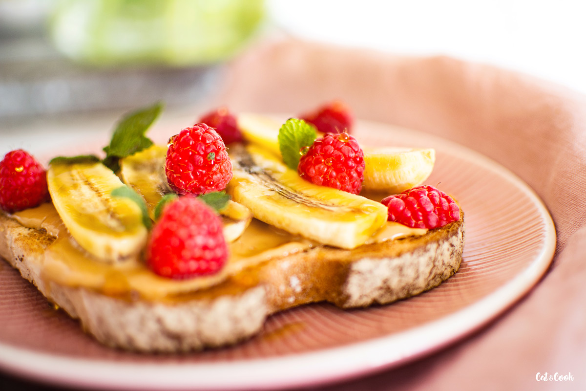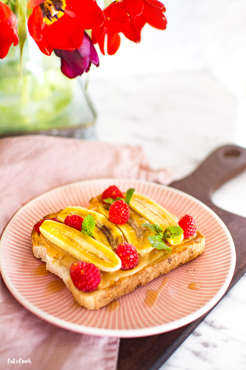 Toustový chléb si můžete snadno upéct doma, na mém blogu najdete recept. Než si koupíte burákové máslo, podívejte se na složení. Je dobré, aby neobsahovalo přidané cukry a oleje. Plátky chleba opečte v topinkovači dozlatova. Potřete ho burákovým máslem. Na jeden toust padne asi jedna lžíce másla, ale výsledné množství nechám na vás 🙂 Máslo se na chlebu začne krásně roztékat a ztratí tak svoji lepivost. Banány nakrájejte na menší kousky a položte na chléb. Přidejte maliny, nasekané pistácie a pokud chcete, zakápněte toust javorovým sirupem.