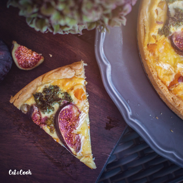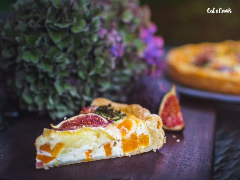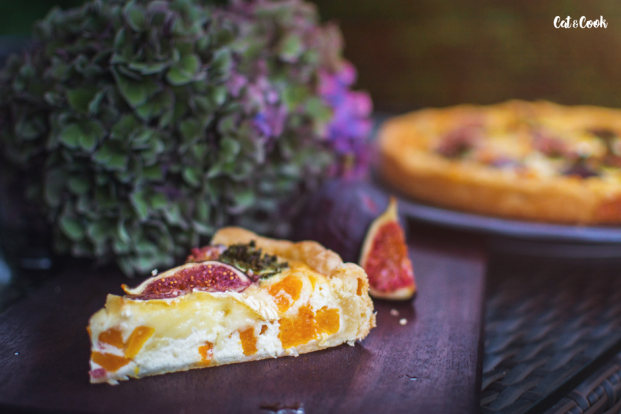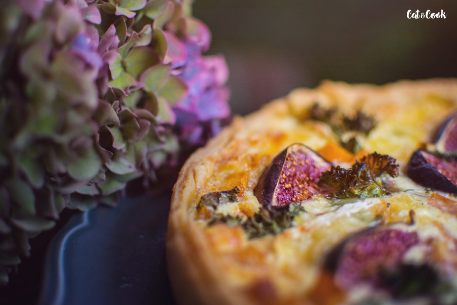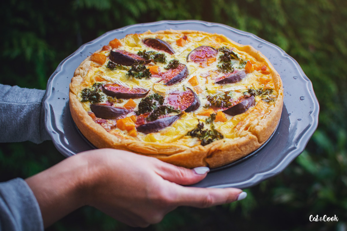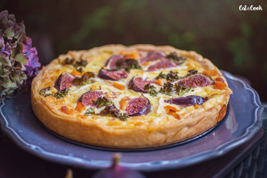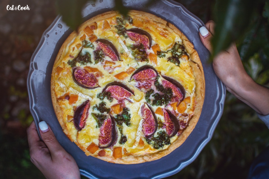 Dýni rozprostřete na částečně upečený korpus, přidejte slaninu, kadeřávek a zalijte připravenou směsí. Navrch rozprostřete sýr, fíky a dejte péct do trouby na 180 stupňů, dokud nebude povrch koláče zlatavý.