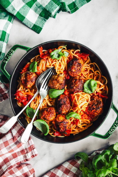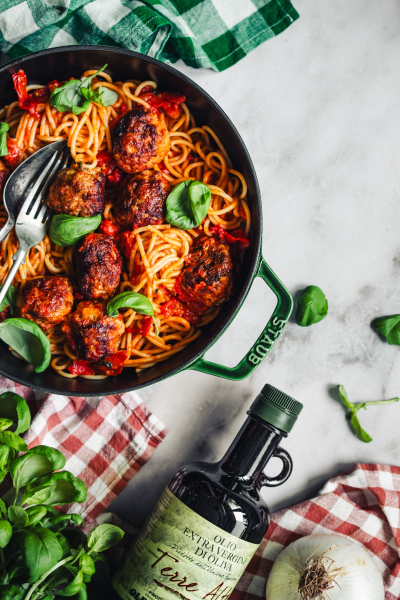 Přidejte rajčata v konzervě, rozmačkejte je vidličkou, osolte a opepřete. Nechte chvíli provařit, pořádně promíchejte a přidejte orestované koule. Pod pokličkou je vařte ještě asi 10 minut, aby omáčka získala na síle a koule se propekly. Až budou koule hotové – vnitřní teplota by měla být 70 stupňů (změřte teploměrem), vyndejte je děrovanou naběračkou nebo lžící do mističky a přikryjte, aby si udržely teplo. Do omáčky přilijte olivový olej a zamíchejte, aby se vytvořila emulze. Dále přidejte trochu parmezánu a bazalku. Promíchejte.
