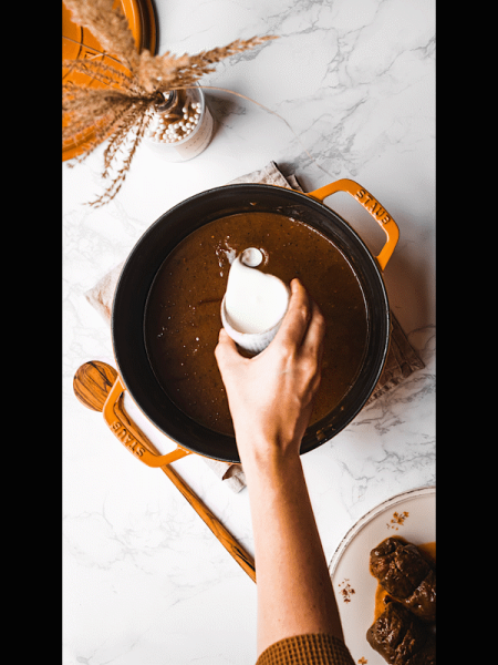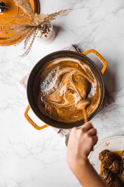 Poté hrnec vyndejte z trouby zpět na plotnu, odklopte a nechte omáčku zredukovat na vyšším ohni. Je možné, že bude dostatečně hustá a nebude to potřeba, to záleží na množství použitého vývaru.