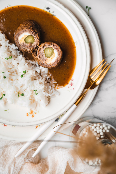 Maso pomažte hořčicí, na jednu stranu položte uzené, vejce, okurku a zabalte. Zavažte kuchyňským provázkem. Nehledejte v tom vědu ani pravidla, půjde vám to přirozeně. 🙂 Nakonec ještě lehce potřete hořčicí zvenku.