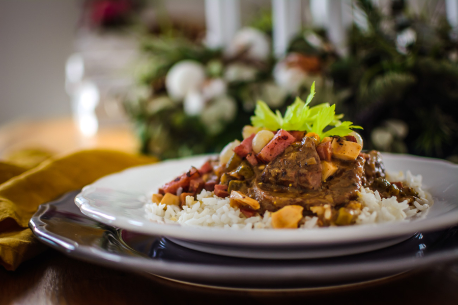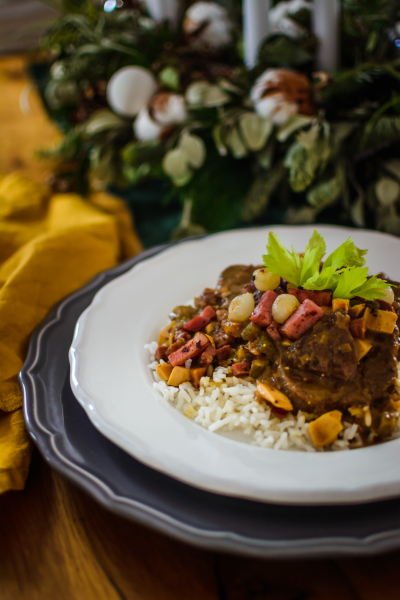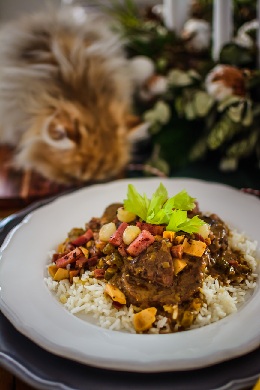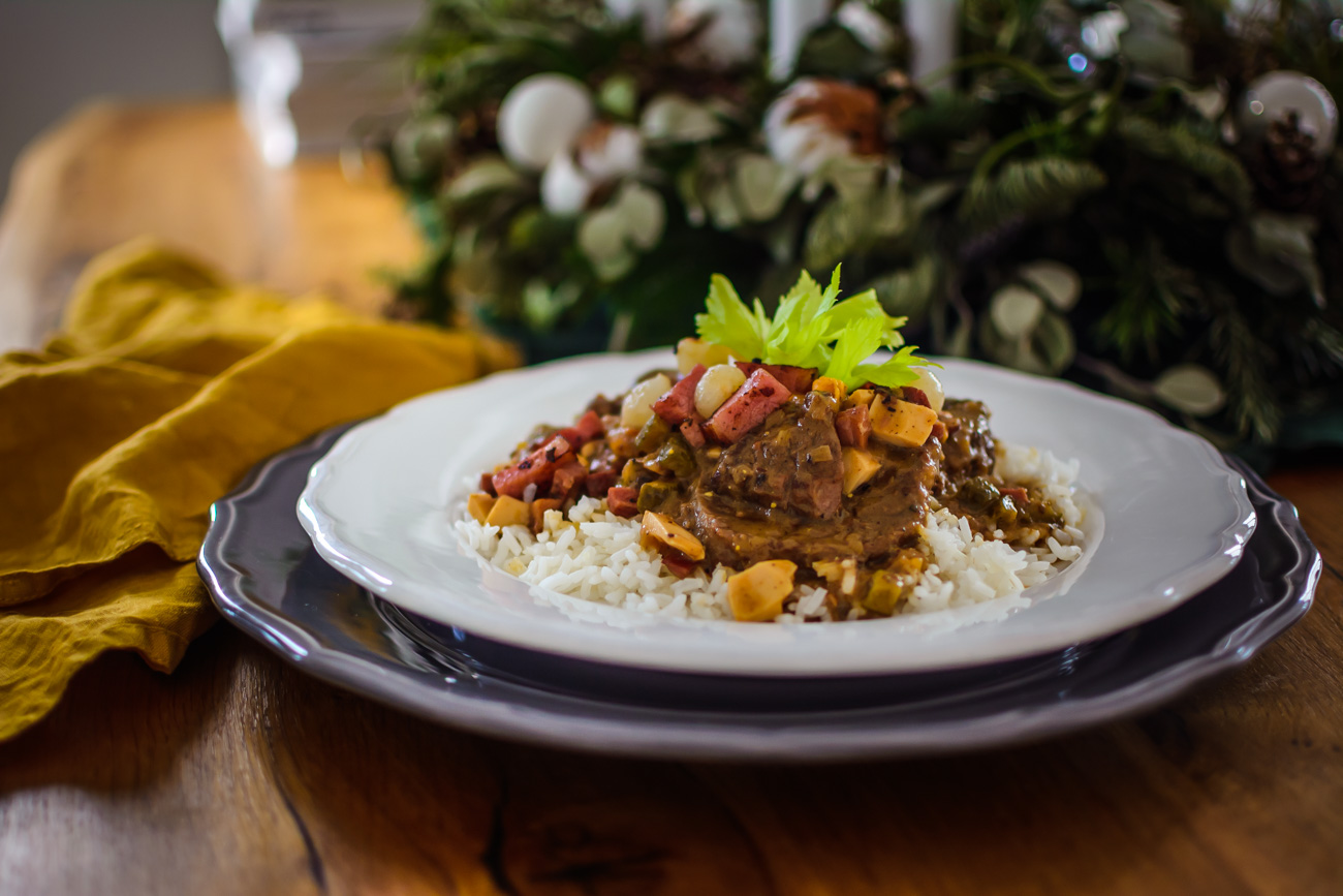 Krkovici či slaninu nakrájejte na menší kostičky. Cibuli nakrájejte najemno (na mém Instagramu ve výběrech můžete najít podrobný návod, jak správně cibuli krájet, tak se třeba mrkněte :-)). V hrnci, ke kterému máte pokličku a je vhodný do trouby, rozehřejte 3 lžíce sádla a máslo. Máslo omáčce dodá skvělou chuť a sádlo nám kromě další chuti zvedne bod zakouření tuku a díky tomu se nám máslo nepřepálí. Přidejte cibuli a restujte na středním plamenu. Cibulku je potřeba restovat dohněda, proto si na tom dejte opravdu záležet a nikam nespěchejte. Po 5 minutách přidejte k cibulce uzené. Až bude cibulka hnědá, přidejte 1,5 lžíce hořčice a restujte ještě asi 2 – 3 minuty.