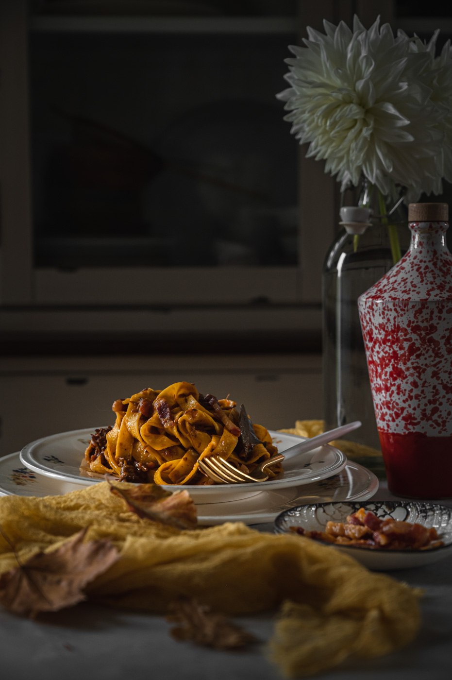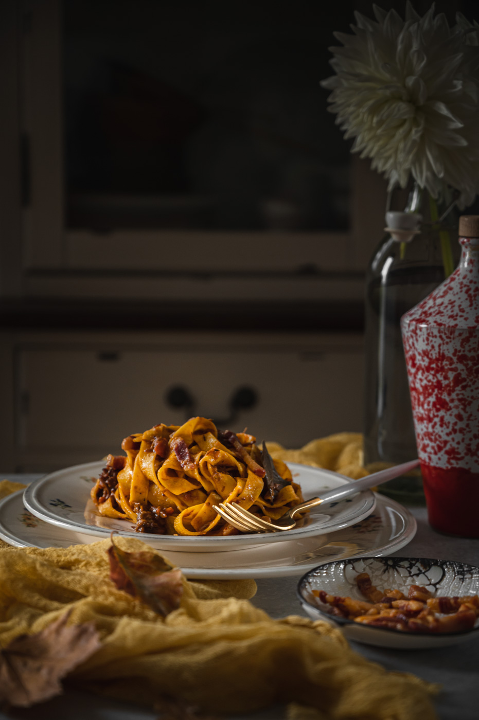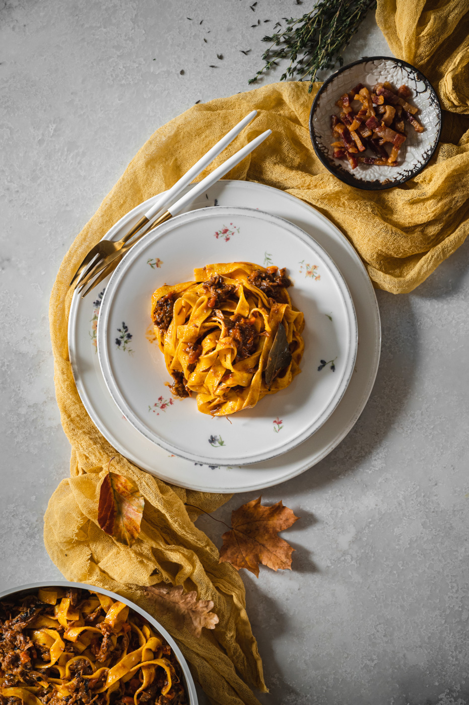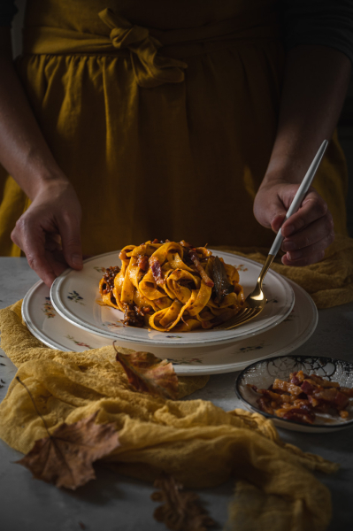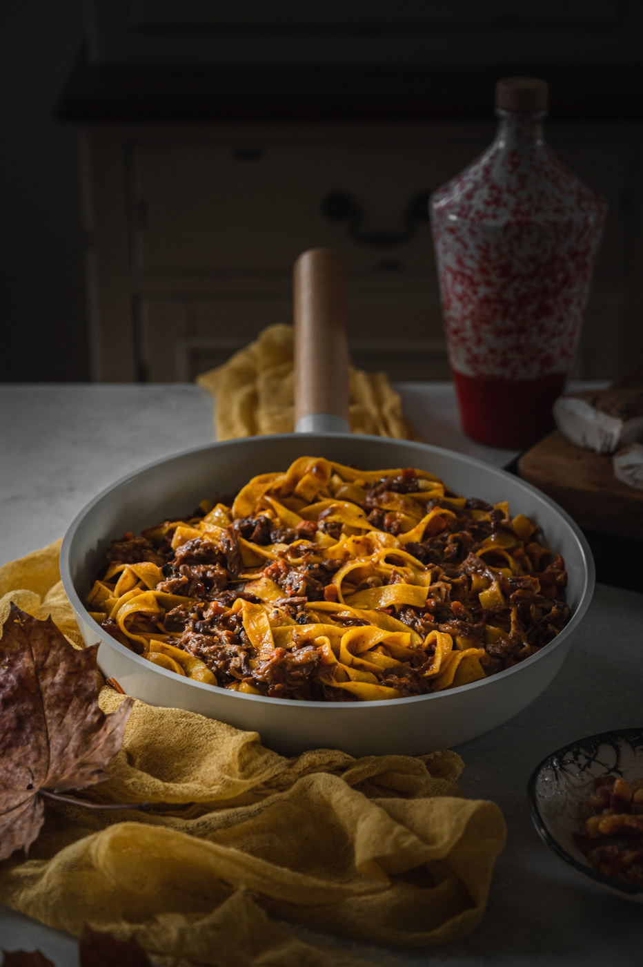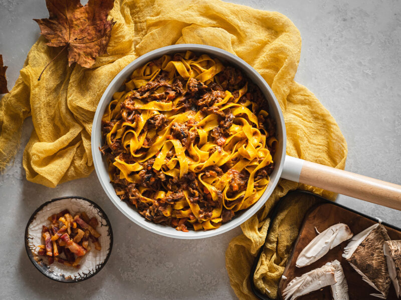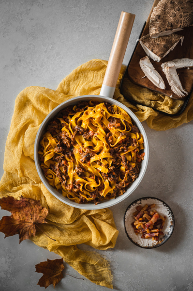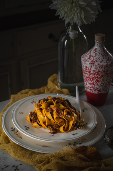 Od mojí milé sledovatelky Karin jsem dostala srnčí kýtu, což byla celkem výzva. K mému překvapení byla hodně šlachovitá a prorostlá, a tak mě hned napadlo něco na styl líček nebo bourguignonu. V lednici jsem ale měla čerstvé těstoviny a rozdělaná rajčata v konzervě… Nakonec jsem si řekla, že zkusím srnčí ragú na takový italský způsob a dopadlo to více než skvěle! 🙂